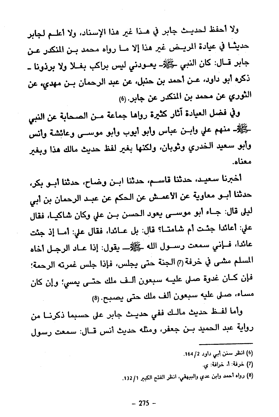 أَخْبَرَنَا سَعِيدٌ حَدَّثَنَا قَاسِمٌ حَدَّثَنَا ابْنُ وَضَّاحٍ حَدَّثَنَا أَبُو بَكْرٍ حَدَّثَنَا أَبُو مُعَاوِيَةَ عَنِ الْأَعْمَشِ عَنِ الْحَكَمِ عَنْ عَبْدِ الرَّحْمَنِ بْنِ أَبِي لَيْلَى قَالَ جَاءَ أَبُو مُوسَى يَعُودُ الْحَسَنَ بْنَ عَلِيٍّ وَكَانَ شَاكِيًا فَقَالَ عَلِيٌّ أَعَائِدًا جِئْتَ أم شامتا قال بلى عَائِدًا فَقَالَ عَلِيٌّ أَمَا إِذْ جِئْتَ عَائِدًا فَإِنِّي سَمِعْتُ رَسُولَ اللَّهِ صَلَّى اللَّهُ عَلَيْهِ وَسَلَّمَ يَقُولُ إِذَا عَادَ الرَّجُلُ أَخَاهُ الْمُسْلِمَ مَشَى فِي خُرَافَةِ الْجَنَّةِ حَتَّى يَجْلِسَ فَإِذَا جَلَسَ غَمَرَتْهُ الرَّحْمَةُ فَإِنْ كَانَ غَدْوَةً صَلَّى عَلَيْهِ سَبْعُونَ أَلْفَ مَلِكٍ حَتَّى يُمْسِيَ وَإِنْ كَانَ مَسَاءً صَلَّى عَلَيْهِ سَبْعُونَ أَلْفَ مَلِكٍ حَتَّى يُصْبِحَ