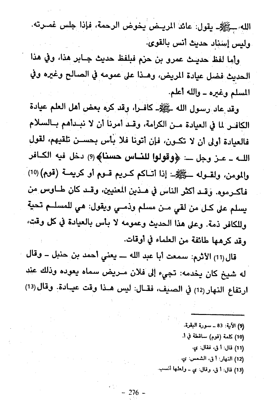 قَالَ الْأَثْرَمُ سَمِعْتُ أَبَا عَبْدِ اللَّهِ يَعْنِي أَحْمَدَ بْنَ حَنْبَلٍ وَقَالَ لَهُ شَيْخٌ كَانَ يَخْدِمُهُ تَجِيءُ إِلَى فُلَانٍ مَرِيضٍ سَمَّاهُ يَعُودُهُ وَذَلِكَ عِنْدَ ارْتِفَاعِ النَّهَارِ فِي الصَّيْفِ فَقَالَ لَيْسَ هَذَا وَقْتُ عِيَادَةٍ