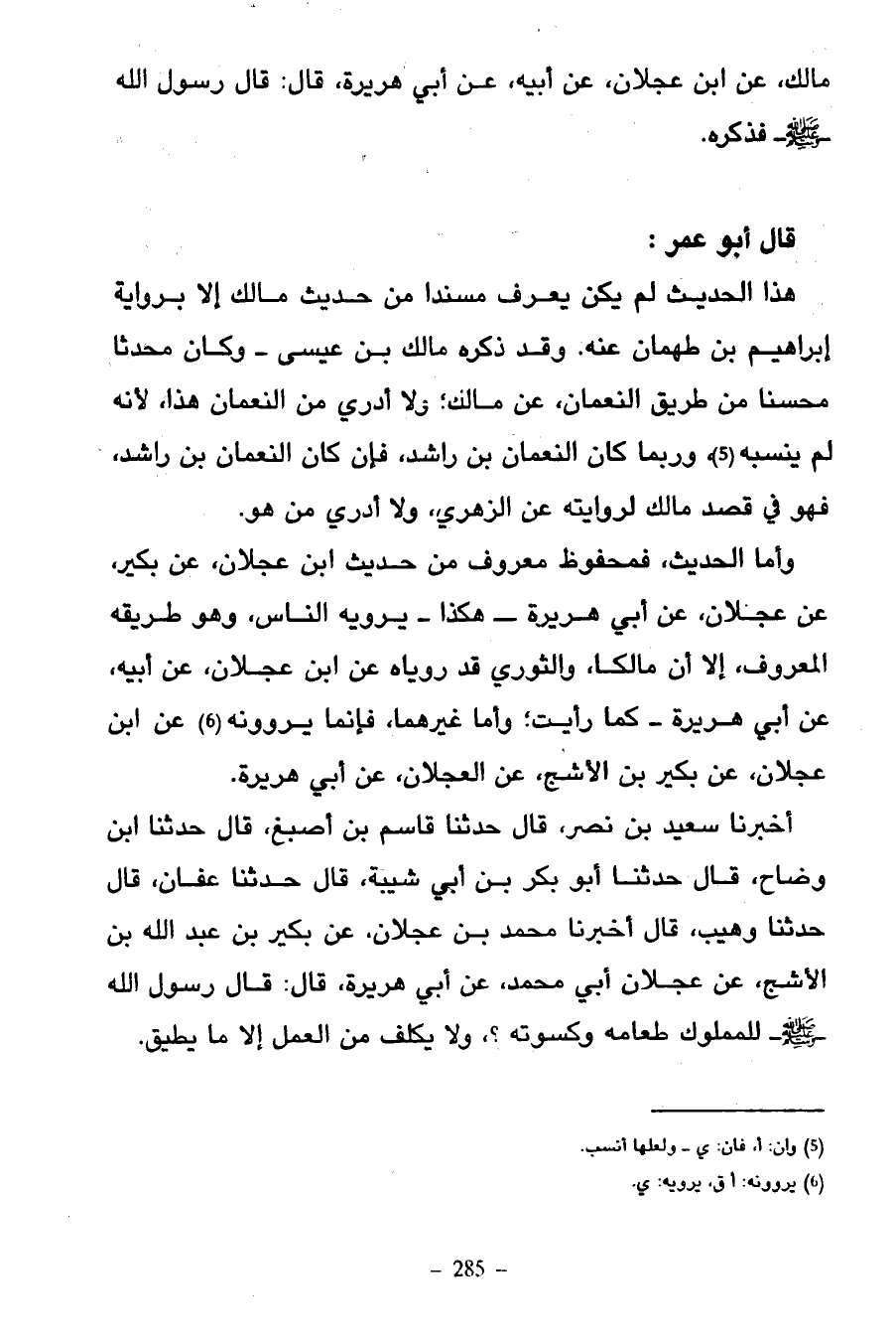 قَالَ أَبُو عُمَرَ هَذَا الْحَدِيثُ لَمْ يَكُنْ يُعْرَفُ مُسْنَدًا مِنْ حَدِيثِ مَالِكٍ إِلَّا بِرِوَايَةِ إِبْرَاهِيمَ بْنِ طَهْمَانَ عَنْهُ وَقَدْ ذَكَرَهُ مَالِكُ بْنُ عِيسَى وَكَانَ مُحَدِّثًا مُحْسِنًا مِنْ طَرِيقِ النُّعْمَانِ عَنْ مَالِكٍ وَلَا أَدْرِي مَنِ النُّعْمَانُ هَذَا لِأَنَّهُ لَمْ يَنْسُبْهُ وَرُبَّمَا كَانَ النُّعْمَانُ بْنُ رَاشِدٍ فَإِنْ كَانَ النُّعْمَانُ بْنُ رَاشِدٍ فَهُوَ فِي قَصْدِ مَالِكٍ لِرِوَايَتِهِ عَنِ الزُّهْرِيِّ وَلَا أَدْرِي مَنْ هُوَ