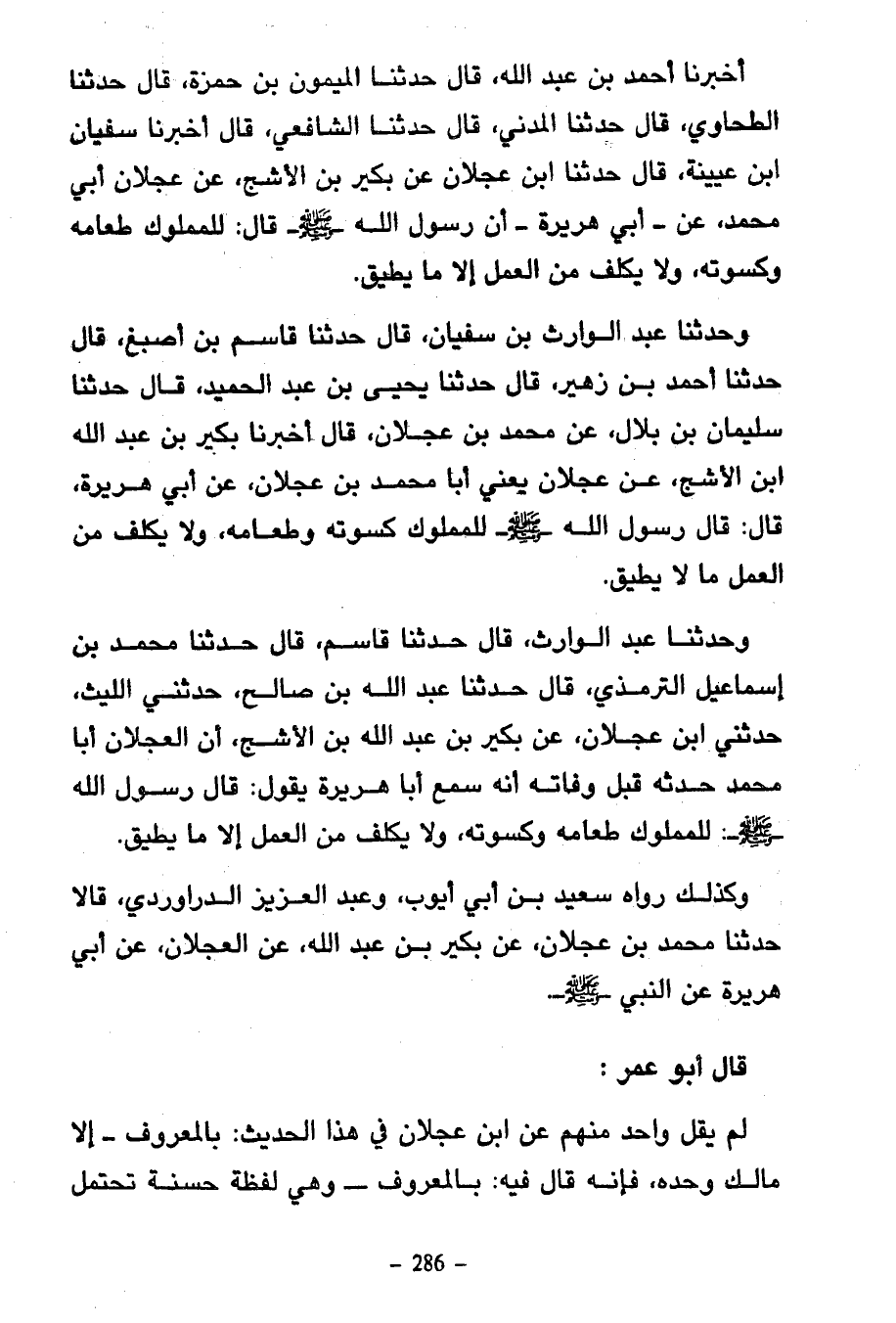 أَخْبَرَنَا أَحْمَدُ بْنُ عَبْدِ اللَّهِ قَالَ حَدَّثَنَا الْمَيْمُونُ بْنُ حَمْزَةَ قَالَ حَدَّثَنَا الطَّحَاوِيُّ قَالَ حَدَّثَنَا الْمَدَنِيُّ قَالَ حَدَّثَنَا الشَّافِعِيُّ قَالَ أَخْبَرَنَا سُفْيَانُ ابْنُ عُيَيْنَةَ قَالَ حَدَّثَنَا ابْنُ عَجْلَانَ عَنْ بُكَيْرِ بْنِ الْأَشَجِّ عَنْ عَجْلَانَ أَبِي مُحَمَّدٍ عَنْ أَبِي هُرَيْرَةَ أَنَّ رَسُولَ اللَّهِ صَلَّى اللَّهُ عَلَيْهِ وَسَلَّمَ قَالَ لِلْمَمْلُوكِ طَعَامُهُ وَكُسْوَتُهُ وَلَا يُكَلَّفُ مِنَ الْعَمَلِ إِلَّا مَا يُطِيقُ