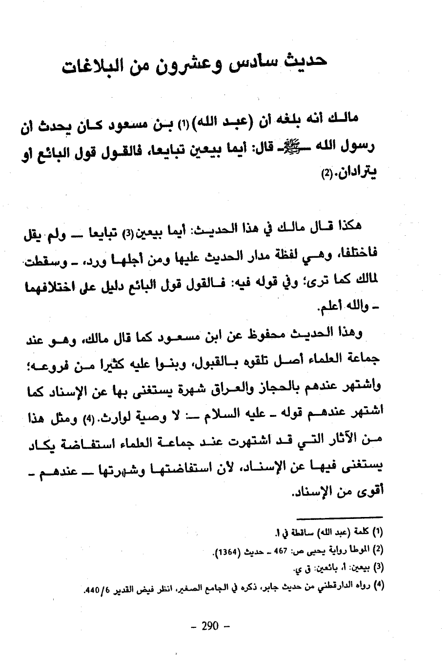 518 - مَالِكٌ أَنَّهُ بَلَغَهُ أَنَّ عَبْدَ اللَّهِ بْنَ مَسْعُودٍ كَانَ يُحَدِّثُ أَنَّ رَسُولَ اللَّهِ صَلَّى اللَّهُ عَلَيْهِ وسلم قال أيما بيعين تبايعا فالقول الْبَائِعِ أَوْ يَتَرَادَّانِ (31 80)