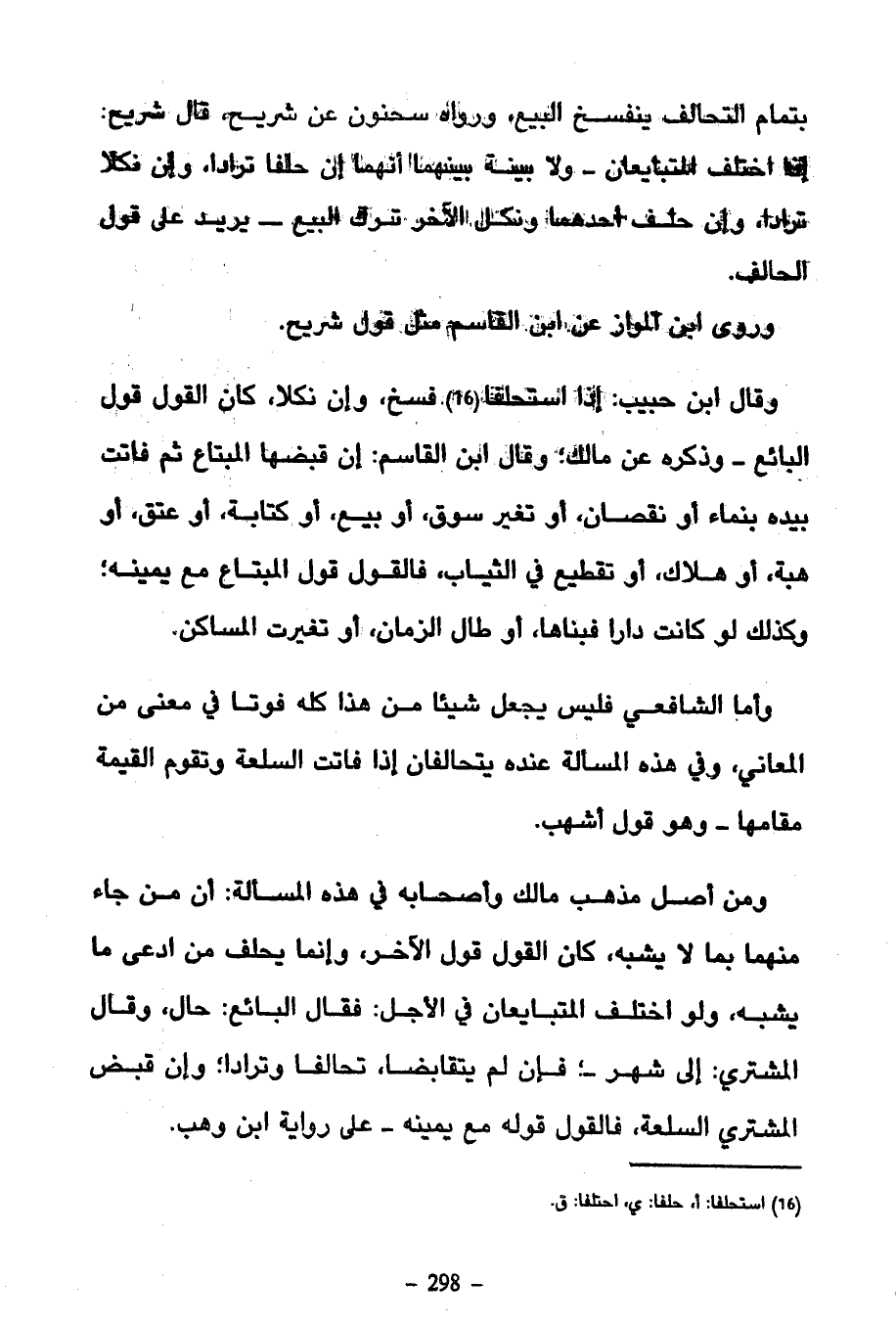 بِتَمَامِ التَّحَالُفِ يَنْفَسِخُ الْبَيْعُ وَرَوَاهُ سَحْنُونٌ عَنْ شُرَيْحٍ قَالَ شُرَيْحٌ إِذَا اخْتَلَفَ الْمُتَبَايِعَانِ وَلَا بَيِّنَةَ بَيْنَهُمَا أَنَّهُمَا إِنْ حَلَفَا تَرَادَّا وَإِنْ نَكَلَا تَرَادَّا وَإِنْ حَلَفَ أَحَدُهُمَا وَنَكَلَ الْآخَرُ تُرِكَ الْبَيْعُ يُرِيدُ عَلَى قَوْلِ الْحَالِفِ