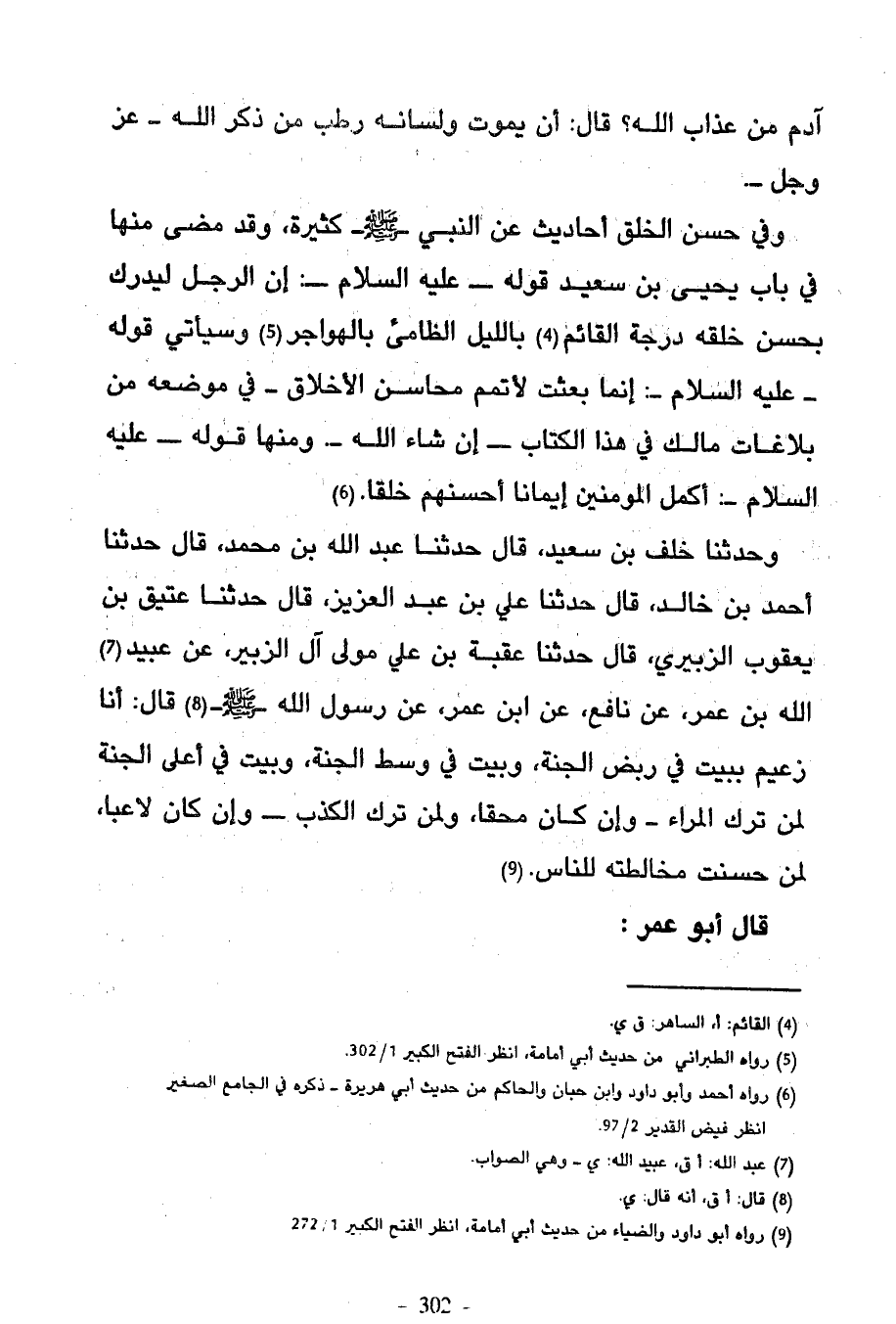 وَحَدَّثَنَا خَلَفُ بْنُ سَعِيدٍ قَالَ حَدَّثَنَا عَبْدُ اللَّهِ بْنُ مُحَمَّدٍ قَالَ حَدَّثَنَا أَحْمَدُ بْنُ خَالِدٍ قَالَ حَدَّثَنَا عَلِيُّ بْنُ عَبْدِ الْعَزِيزِ قَالَ حَدَّثَنَا عَتِيقُ بْنُ يَعْقُوبَ الزُّبَيْرِيُّ قَالَ حَدَّثَنَا عُقْبَةُ بْنُ عَلِيٍّ مَوْلَى آلِ الزُّبَيْرِ عَنْ عُبَيْدِ اللَّهِ بْنِ عُمَرَ عَنْ نَافِعٍ عَنِ ابْنِ عُمَرَ عَنْ رَسُولِ اللَّهِ صَلَّى اللَّهُ عَلَيْهِ وَسَلَّمَ قال أَنَا زَعِيمُ بِبَيْتٍ فِي رَبَضِ الْجَنَّةِ وَبَيْتٍ فِي وَسَطِ الْجَنَّةَ وَبَيْتٍ فِي أَعْلَى الْجَنَّةِ لِمَنْ تَرَكَ الْمِرَاءَ وَإِنْ كَانَ مُحِقًّا وَلِمَنْ تَرَكَ الْكَذِبَ وَإِنْ كَانَ لَاعِبًا لِمَنْ حَسُنَتْ مُخَالَطَتُهُ لِلنَّاسِ