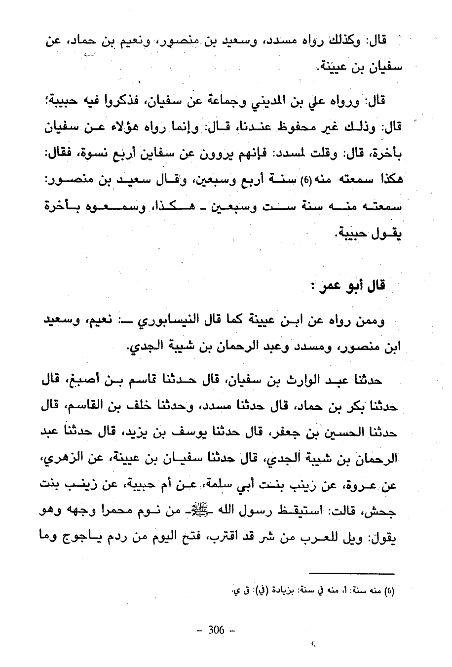 قَالَ وَرَوَاهُ عَلِيُّ بْنُ الْمَدِينِيِّ وَجَمَاعَةٌ عَنْ سُفْيَانَ فَذَكَرُوا فِيهِ حَبِيبَةَ قَالَ وَذَلِكَ غَيْرُ مَحْفُوظٍ عِنْدَنَا قَالَ وَإِنَّمَا رَوَاهُ هَؤُلَاءِ عَنْ سُفْيَانَ بِآخِرَةٍ قَالَ وَقُلْتُ لِمُسَدَّدٍ فَإِنَّهُمْ يَرْوُونَ عَنْ سُفْيَانَ أَرْبَعَ نِسْوَةٍ فَقَالَ هَكَذَا سَمِعْتُهُ مِنْهُ سَنَةَ أَرْبَعٍ وَسَبْعِينَ وَقَالَ سَعِيدُ بْنُ مَنْصُورٍ سَمِعْتُهُ مِنْهُ سَنَةَ سِتٍّ وَسَبْعِينَ هَكَذَا وَسَمِعُوهُ بِآخِرَةٍ يَقُولُ حَبِيبَةُ