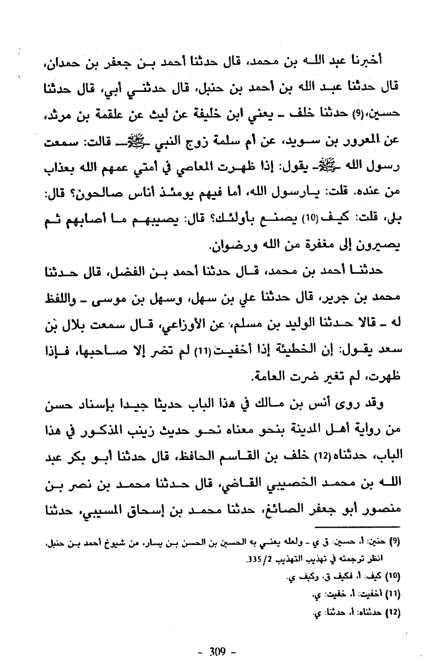 أَخْبَرَنَا عَبْدُ اللَّهِ بْنُ مُحَمَّدٍ قَالَ حَدَّثَنَا أَحْمَدُ بْنُ جَعْفَرِ بْنِ حَمْدَانَ قَالَ حَدَّثَنَا عَبْدُ اللَّهِ بْنُ أَحْمَدَ بْنِ حَنْبَلٍ قَالَ حَدَّثَنِي أَبِي قَالَ حَدَّثَنَا حُسَيْنٌ حَدَّثَنَا خَلَفٌ يَعْنِي ابْنَ خَلِيفَةَ عَنْ لَيْثٍ عَنْ عَلْقَمَةَ بن مرثد عن المعرو بْنِ سُوَيْدٍ عَنْ أُمِّ سَلَمَةَ زَوْجِ النَّبِيِّ صَلَّى اللَّهُ عَلَيْهِ وَسَلَّمَ قَالَتْ سَمِعْتُ رَسُولَ اللَّهِ صَلَّى اللَّهُ عَلَيْهِ وَسَلَّمَ يَقُولُ إِذَا ظَهَرَتِ الْمَعَاصِي فِي أُمَّتِي عَمَّهُمُ اللَّهُ بِعَذَابٍ مِنْ عِنْدِهِ