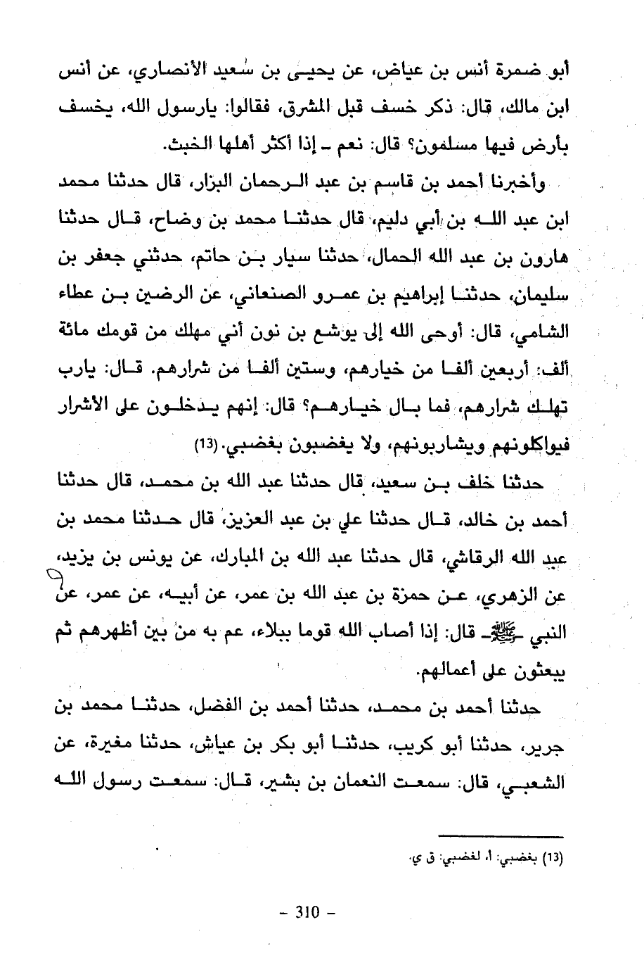 أَبُو ضَمْرَةَ أَنَسُ بْنُ عِيَاضٍ عَنْ يَحْيَى بْنِ سَعِيدٍ الأنصاري عن أنس ابن مَالِكٍ قَالَ ذُكِرَ خَسْفٌ قِبَلَ الْمَشْرِقِ فَقَالُوا يَا رَسُولَ اللَّهِ يُخْسَفُ بِأَرْضٍ فِيهَا مُسْلِمُونَ قَالَ نَعَمْ إِذَا أَكْثَرَ أَهْلُهَا الْخَبَثَ