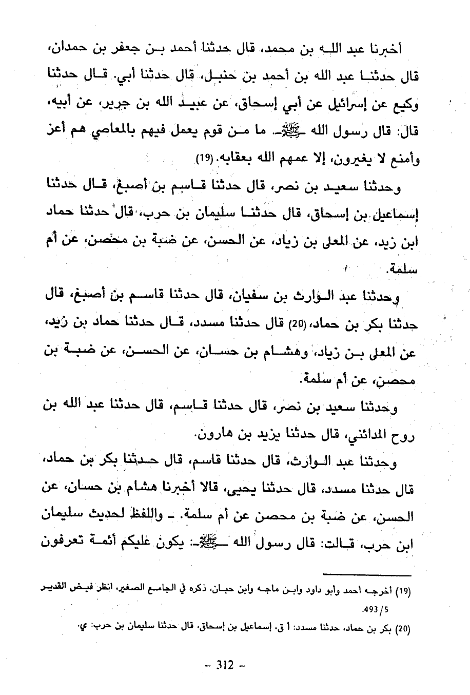 وَحَدَّثَنَا سَعِيدُ بْنُ نَصْرٍ قَالَ حَدَّثَنَا قَاسِمُ بْنُ أَصْبَغَ قَالَ حَدَّثَنَا إِسْمَاعِيلُ بْنُ إِسْحَاقَ قَالَ حَدَّثَنَا سُلَيْمَانُ بْنُ حَرْبٍ قَالَ حَدَّثَنَا حماد ابن زَيْدٍ عَنِ الْمُعَلَّى بْنِ زِيَادٍ عَنِ الْحَسَنِ عَنْ ضَبَّةَ بْنِ مِحْصَنٍ عَنْ أُمِّ سَلَمَةَ