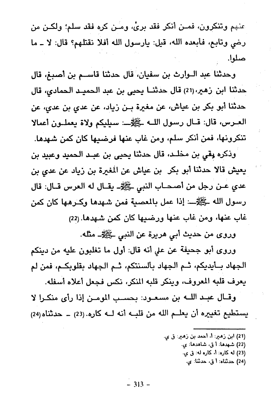 وَحَدَّثَنَا عَبْدُ الْوَارِثِ بْنُ سُفْيَانَ قَالَ حَدَّثَنَا قاسم بن أَصْبَغَ قَالَ حَدَّثَنَا ابْنُ زُهَيْرٍ قَالَ حَدَّثَنَا يَحْيَى بْنُ عَبْدِ الْحَمِيدِ الْحَمَّادِيُّ قَالَ حَدَّثَنَا أَبُو بَكْرِ بْنُ عَيَّاشٍ عَنْ مُغِيرَةَ بْنِ زِيَادٍ عَنْ عَدِيِّ بْنِ عَدِيٍّ عَنِ الْعُرْسِ قَالَ قَالَ رَسُولُ اللَّهِ صَلَّى اللَّهُ عَلَيْهِ وَسَلَّمَ سَيَلِيكُمْ وُلَاةٌ يَعْمَلُونَ أَعْمَالًا تُنْكِرُونَهَا فَمَنْ أَنْكَرَ سَلِمَ وَمَنْ غَابَ عَنْهَا فَرَضِيَهَا كَانَ كَمَنْ شَهِدَهَا
