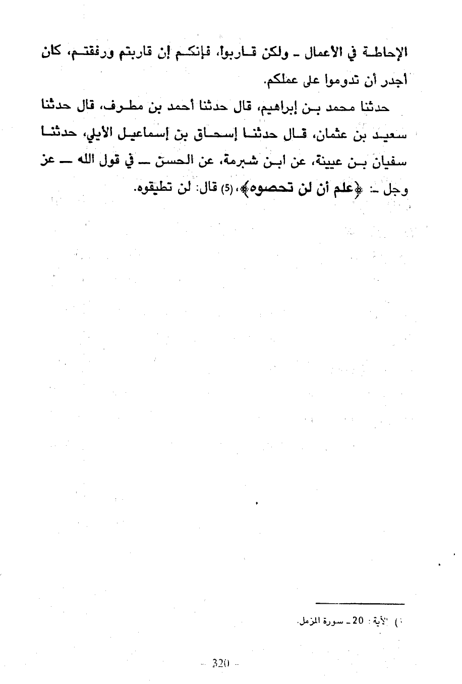 حَدَّثَنَا مُحَمَّدُ بْنُ إِبْرَاهِيمَ قَالَ حَدَّثَنَا أَحْمَدُ بْنُ مُطَرِّفٍ قَالَ حَدَّثَنَا سَعِيدُ بْنُ عُثْمَانَ قَالَ حَدَّثَنَا إِسْحَاقُ بْنُ إِسْمَاعِيلَ الْأَيْلِيُّ حَدَّثَنَا سُفْيَانُ بْنُ عُيَيْنَةَ عَنِ ابْنِ شُبْرُمَةَ عَنِ الْحَسَنِ فِي قَوْلِ اللَّهِ عَزَّ وَجَلَّ عَلِمَ أَنْ لَنْ تُحْصُوهُ قَالَ لَنْ تُطِيقُوهُ