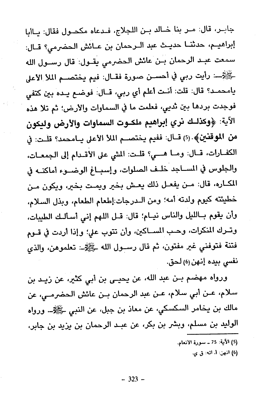 جَابِرٍ قَالَ مَرَّ بِنَا خَالِدُ بْنُ اللَّجْلَاجِ فَدَعَاهُ مَكْحُولٌ فَقَالَ يَا أَبَا إِبْرَاهِيمَ حَدِّثْنَا حَدِيثَ عَبْدِ الرَّحْمَنِ بْنِ عَائِشٍ الْحَضْرَمِيِّ قَالَ سَمِعْتُ عَبْدَ الرَّحْمَنِ بْنَ عَائِشٍ الْحَضْرَمِيَّ يَقُولُ قَالَ رَسُولُ اللَّهِ صَلَّى اللَّهُ عَلَيْهِ وَسَلَّمَ رَأَيْتُ رَبِّي فِي أَحْسَنِ صُورَةٍ فَقَالَ فِيمَ يَخْتَصِمُ الْمَلَأُ الْأَعْلَى يَا مُحَمَّدُ قَالَ قُلْتُ أَنْتَ أَعْلَمُ أَيْ رَبِّي قَالَ فَوَضَعَ يَدَهُ بَيْنَ كَتِفَيَّ فَوَجَدْتُ بَرْدَهَا بَيْنَ ثَدْيَيَّ فَعَلِمْتُ مَا فِي السَّمَاوَاتِ وَالْأَرْضِ ثُمَّ تَلَا هَذِهِ الآية وكذلك نري إبرهيم ملكوت السماوات والأرض وليكون من المؤقنين قَالَ فَفِيمَ يَخْتَصِمُ الْمَلَأُ الْأَعْلَى يَا مُحَمَّدُ قُلْتُ فِي الْكَفَّارَاتِ قَالَ وَمَا هِيَ قُلْتُ الْمَشْيُ عَلَى الْأَقْدَامِ إِلَى الْجُمُعَاتِ وَالْجُلُوسُ فِي الْمَسَاجِدِ خَلْفَ الصَّلَوَاتِ وَإِسْبَاغُ الْوُضُوءِ أَمَاكِنَهُ فِي الْمَكَارِهِ قَالَ مَنْ يَفْعَلُ ذَلِكَ يَعِشْ بِخَيْرٍ وَيَمُتْ بِخَيْرٍ وَيَكُونُ مِنْ خَطِيئَتِهِ كَيَوْمِ وَلَدَتْهُ أُمُّهُ وَمِنَ الدَّرَجَاتِ إِطْعَامُ الطَّعَامِ وَبَذْلُ السَّلَامِ وَأَنْ يَقُومَ بِاللَّيْلِ وَالنَّاسُ نِيَامٌ قَالَ قُلِ اللَّهُمَّ إِنِّي أَسْأَلُكَ الطَّيِّبَاتِ وَتَرْكَ الْمُنْكَرَاتِ وَحُبَّ الْمَسَاكِينِ وَأَنْ تَتُوبَ عَلَيَّ وَإِذَا أَرَدْتَ فِي قَوْمٍ فِتْنَةً فَتَوَفَّنِي غَيْرَ مَفْتُونٍ ثُمَّ قَالَ رَسُولُ اللَّهِ صَلَّى اللَّهُ عَلَيْهِ وَسَلَّمَ تَعَلَّمُوهُنَّ وَالَّذِي نَفْسِي بِيَدِهِ إِنَّهُنَّ لَحَقٌّ