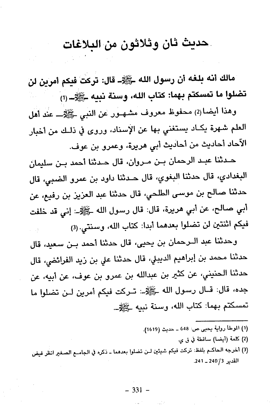 128 - مَالِكٌ أَنَّهُ بَلَغَهُ أَنَّ رَسُولَ اللَّهِ صَلَّى اللَّهُ عَلَيْهِ وَسَلَّمَ قَالَ تَرَكْتُ فِيكُمْ أَمْرَيْنِ لَنْ تَضِلُّوا مَا تَمَسَّكْتُمْ بِهِمَا كِتَابُ اللَّهِ وَسُنَّةُ نَبِيِّهِ
