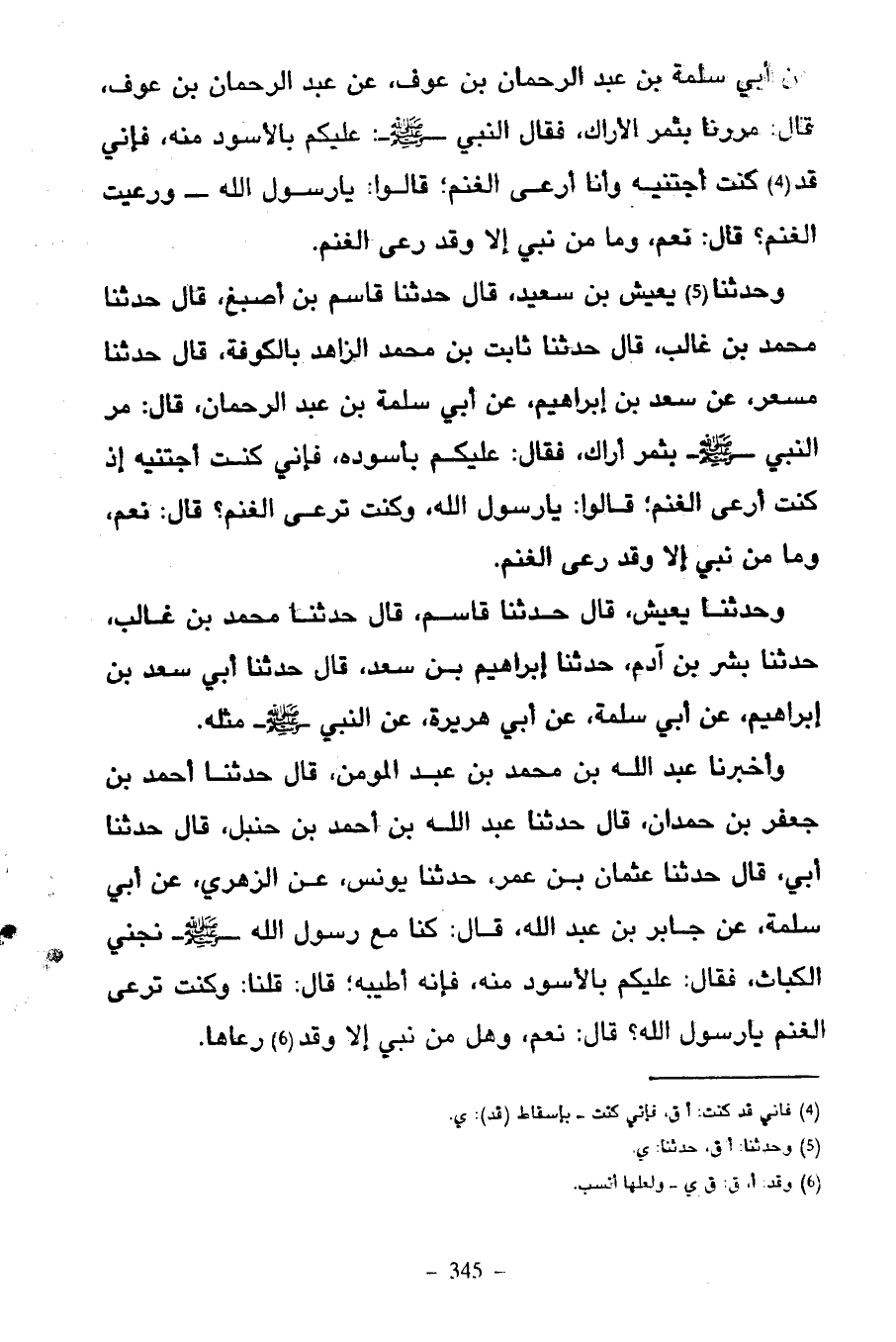 عَنْ أَبِي سَلَمَةَ بْنِ عَبْدِ الرَّحْمَنِ بْنِ عَوْفٍ عَنْ عَبْدِ الرَّحْمَنِ بْنِ عَوْفٍ قَالَ مررنا بمثر الْأَرَاكِ فَقَالَ النَّبِيُّ صَلَّى اللَّهُ عَلَيْهِ وَسَلَّمَ عَلَيْكُمْ بِالْأَسْوَدِ مِنْهُ فَإِنِّي قَدْ كُنْتُ أَجْتَنِيهِ وَأَنَا أَرْعَى الْغَنَمَ قَالُوا يَا رَسُولَ اللَّهِ وَرَعَيْتَ الْغَنَمَ قَالَ نَعَمْ وَمَا مِنْ نَبِيٍّ إِلَّا وَقَدْ رَعَى الْغَنَمَ