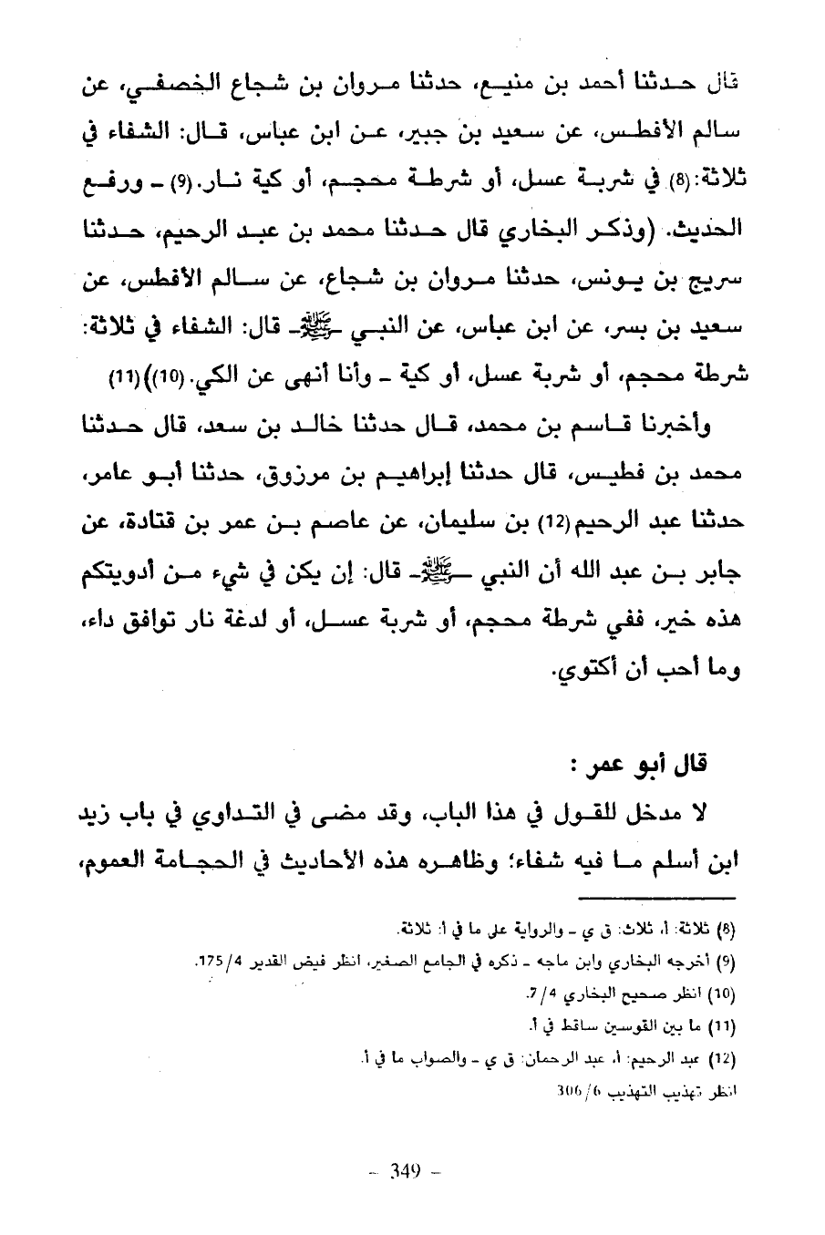 (وَذَكَرَ الْبُخَارِيُّ قَالَ حَدَّثَنَا مُحَمَّدُ بْنُ عَبْدِ الرَّحِيمِ حَدَّثَنَا سُرَيْجُ بْنُ يُونُسَ حَدَّثَنَا مَرْوَانُ بْنُ شُجَاعٍ عَنْ سَالِمٍ الْأَفْطَسِ عَنْ سَعِيدِ بْنِ بُسْرٍ عَنِ ابْنِ عَبَّاسٍ عَنِ النَّبِيِّ صَلَّى اللَّهُ عَلَيْهِ وَسَلَّمَ قَالَ الشِّفَاءُ فِي ثَلَاثَةٍ شَرْطَةِ مِحْجَمٍ أَوْ شَرْبَةِ عَسَلٍ أَوْ كَيَّةٍ وَأَنَا أَنْهَى عَنِ الْكَيِّ)