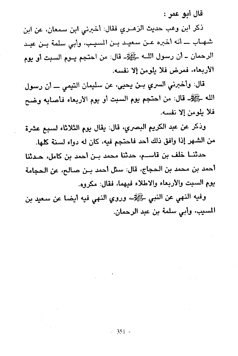 حَدَّثَنَا خَلَفُ بْنُ قَاسِمٍ حَدَّثَنَا مُحَمَّدُ بْنُ أَحْمَدَ بْنِ كَامِلٍ حَدَّثَنَا أَحْمَدُ بْنُ مُحَمَّدِ بْنِ الْحَجَّاجِ قَالَ سُئِلَ أَحْمَدُ بْنُ صَالِحٍ عَنِ الْحِجَامَةِ يَوْمَ السَّبْتِ وَالْأَرْبِعَاءِ وَالِاطِّلَاءِ فِيهِمَا فَقَالَ مَكْرُوهٌ