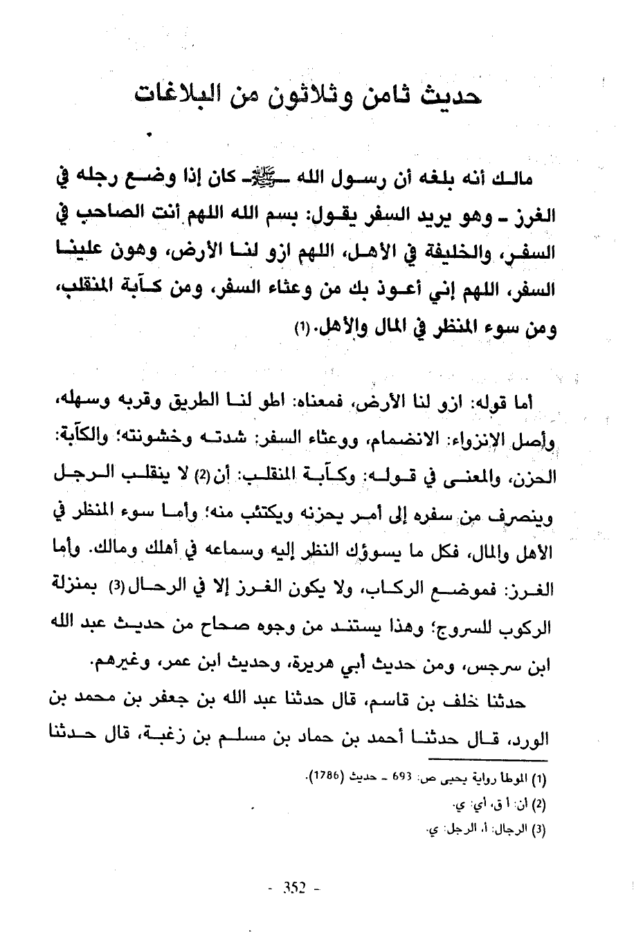 728 - مَالِكٌ أَنَّهُ بَلَغَهُ أَنَّ رَسُولَ اللَّهِ صَلَّى اللَّهُ عَلَيْهِ وَسَلَّمَ كَانَ إِذَا وَضَعَ رِجْلَهُ فِي الْغَرْزِ وَهُوَ يُرِيدُ السَّفَرَ يَقُولُ بِسْمِ اللَّهِ اللَّهُمَّ أَنْتَ الصَّاحِبُ فِي السَّفَرِ وَالْخَلِيفَةُ فِي الْأَهْلِ اللَّهُمَّ ازْوِ لَنَا الْأَرْضَ وَهَوِّنْ عَلَيْنَا السَّفَرَ اللَّهُمَّ إِنِّي أَعُوذُ بِكَ مِنْ وَعْثَاءِ السَّفَرِ وَمِنْ كَآبَةِ الْمُنْقَلَبِ وَمِنْ سُوءِ الْمَنْظَرِ فِي الْمَالِ وَالْأَهْلِ (54 34)