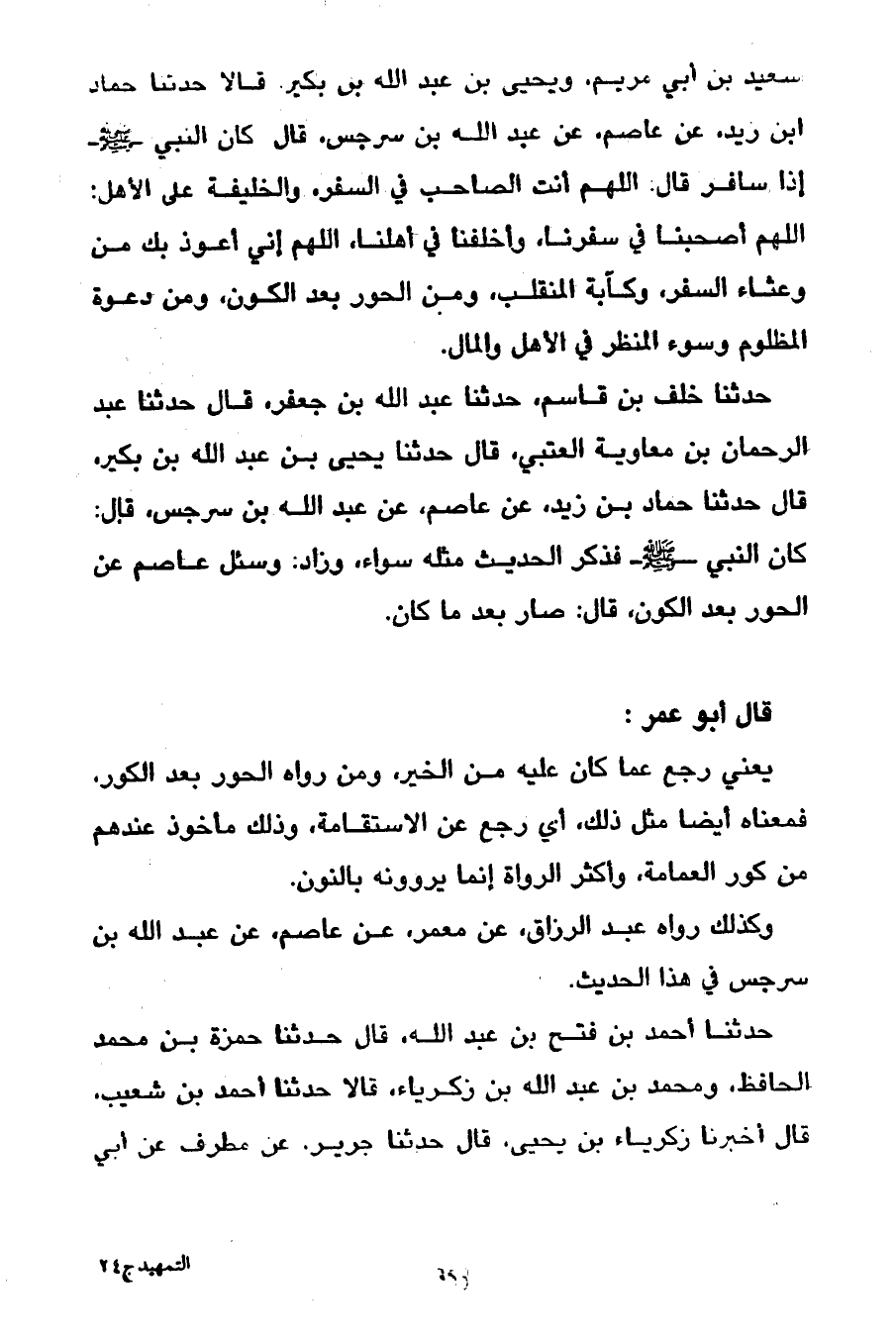 حَدَّثَنَا خَلَفُ بْنُ قَاسِمٍ حَدَّثَنَا عَبْدُ اللَّهِ بْنِ جَعْفَرٍ قَالَ حَدَّثَنَا عَبْدُ الرَّحْمَنِ بْنُ مُعَاوِيَةَ الْعُتْبِيُّ قَالَ حَدَّثَنَا يَحْيَى بْنُ عَبْدِ اللَّهِ بْنِ بُكَيْرٍ قَالَ حَدَّثَنَا حَمَّادُ بْنُ زَيْدٍ عَنْ عَاصِمٍ عَنْ عَبْدِ اللَّهِ بْنِ سَرْجِسَ قَالَ كَانَ النَّبِيُّ صَلَّى اللَّهُ عَلَيْهِ وَسَلَّمَ فَذَكَرَ الْحَدِيثَ مِثْلَهُ سَوَاءً وَزَادَ وَسُئِلَ عَاصِمٌ عَنِ الْحَوْرِ بَعْدَ الْكَوْنِ قَالَ صَارَ بَعْدَ مَا كَانَ قَالَ أَبُو عُمَرَ يَعْنِي رَجَعَ عَمَّا كَانَ عَلَيْهِ مِنَ الْخَيْرِ وَمَنْ رَوَاهُ الْحَوْرِ بَعْدَ الْكَوْرِ فَمَعْنَاهُ أَيْضًا مِثْلُ ذَلِكَ أَيْ رَجَعَ عَنِ الِاسْتِقَامَةِ وَذَلِكَ مَأْخُوذٌ عِنْدَهُمْ مِنْ كَوْرِ الْعِمَامَةِ وَأَكْثَرُ الرُّوَاةِ إِنَّمَا يَرْوُونَهُ بِالنُّونِ