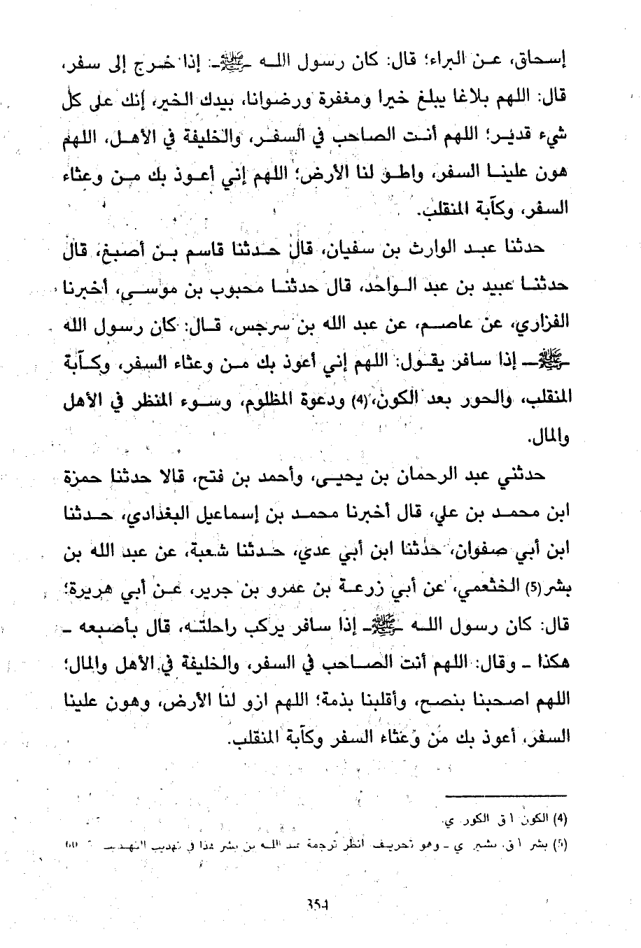 حَدَّثَنِي عَبْدُ الرَّحْمَنِ بْنُ يَحْيَى وَأَحْمَدُ بْنُ فَتْحٍ قالا حدثنا حمزة ابن مُحَمَّدِ بْنِ عَلِيٍّ قَالَ أَخْبَرَنَا مُحَمَّدُ بْنُ إِسْمَاعِيلَ الْبَغْدَادِيُّ حَدَّثَنَا ابْنُ أَبِي صَفْوَانَ حَدَّثَنَا ابْنُ أَبِي عَدِيٍّ حَدَّثَنَا شُعْبَةُ عَنْ عَبْدِ اللَّهِ بْنِ بِشْرٍ الْخَثْعَمِيُّ عَنْ أَبِي زُرْعَةَ بْنِ عَمْرِو بْنِ جَرِيرٍ عَنْ أَبِي هُرَيْرَةَ قَالَ كَانَ رَسُولُ اللَّهِ صَلَّى اللَّهُ عَلَيْهِ وَسَلَّمَ إِذَا سَافَرَ يَرْكَبُ رَاحِلَتَهُ قَالَ بِأُصْبُعِهِ هَكَذَا وَقَالَ اللَّهُمَّ أَنْتَ الصَّاحِبُ فِي السَّفَرِ وَالْخَلِيفَةُ فِي الْأَهْلِ وَالْمَالِ اللَّهُمَّ اصْحَبْنَا بِنُصْحٍ وَاقْلِبْنَا بِذِمَّةٍ اللَّهُمَّ ازْوِ لَنَا الْأَرْضَ وَهَوِّنْ عَلَيْنَا السَّفَرَ أَعُوذُ بِكَ مِنْ وَعْثَاءِ السَّفَرِ وكآبة المنقلب