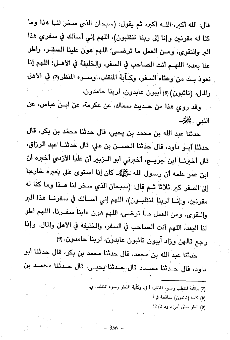 وَإِنَّا إِلَى رَبِّنَا لَمُنْقَلِبُونَ اللَّهُمَّ إِنِّي أَسْأَلُكَ فِي سَفَرِي هَذَا الْبِرَّ وَالتَّقْوَى وَمِنَ الْعَمَلِ مَا تَرْضَى اللَّهُمَّ هَوِّنْ عَلَيْنَا السَّفَرَ وَاطْوِ عَنَّا بُعْدَهُ اللَّهُمَّ أَنْتَ الصَّاحِبُ فِي السَّفَرِ وَالْخَلِيفَةُ فِي الْأَهْلِ اللَّهُمَّ إِنَّا نَعُوذُ بِكَ مِنْ وَعْثَاءِ السَّفَرِ وَكَآبَةِ الْمُنْقَلَبِ وَسُوءِ الْمَنْظَرِ فِي الْأَهْلِ وَالْمَالِ تَائِبُونَ آيِبُونَ عَابِدُونَ لِرَبِّنَا حَامِدُونَ