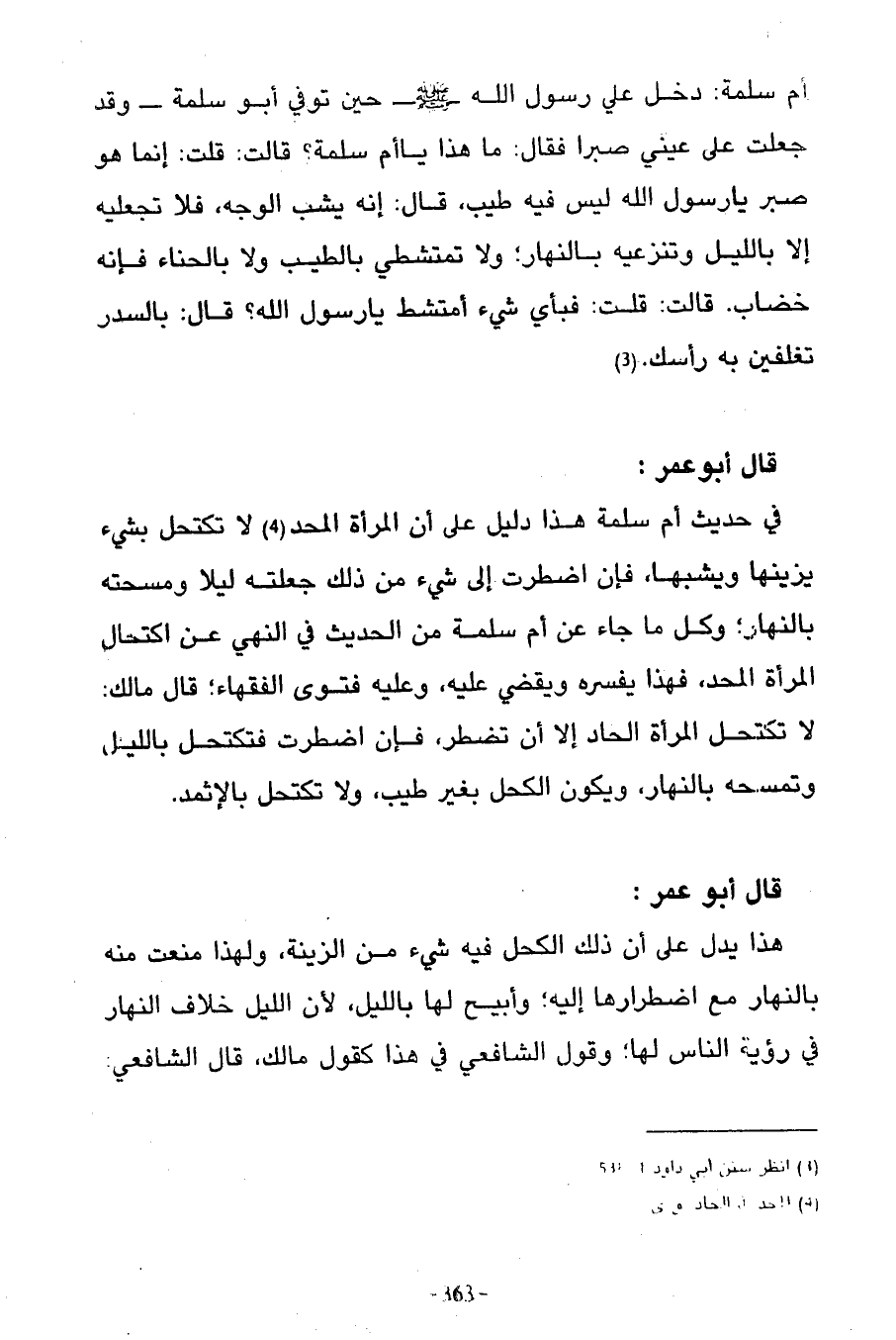 قَالَ أَبُو عُمَرَ فِي حَدِيثِ أُمِّ سَلَمَةَ هَذَا دَلِيلٌ عَلَى أَنَّ الْمَرْأَةَ الْمُحِدَّ لَا تَكْتَحِلُ بِشَيْءٍ يُزَيِّنُهَا وَيُشِبُّهَا فَإِنِ اضْطُرَّتْ إِلَى شَيْءٍ مِنْ ذَلِكَ جَعَلَتْهُ لَيْلًا وَمَسَحَتْهُ بِالنَّهَارِ وَكُلُّ مَا جَاءَ عَنْ أُمِّ سَلَمَةَ مِنَ الْحَدِيثِ فِي النَّهْيِ عَنْ اكْتِحَالِ الْمَرْأَةِ الْمُحِدِّ فَهَذَا يُفَسِّرُهُ وَيَقْضِي عَلَيْهِ وَعَلَيْهِ فَتْوَى الْفُقَهَاءِ قَالَ مَالِكٌ لَا تَكْتَحِلُ الْمَرْأَةُ الْحَادُّ إِلَّا أَنْ تُضْطَرَّ فَإِنِ اضْطُرَّتْ فَتَكْتَحِلُ بِاللَّيْلِ وَتَمْسَحُهُ بِالنَّهَارِ وَيَكُونُ الْكُحْلُ بِغَيْرِ طِيبٍ وَلَا تَكْتَحِلُ بِالْإِثْمِدِ
