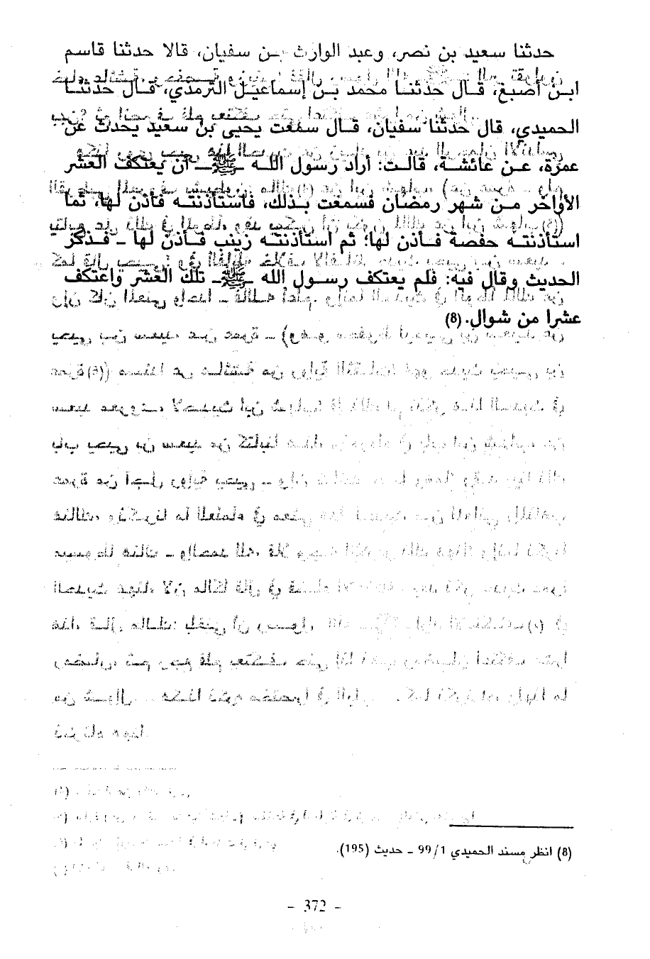 حَدَّثَنَا سَعِيدُ بْنُ نَصْرٍ وَعَبْدُ الْوَارِثِ بْنُ سفيان قالا حدثنا قاسم ابن أَصْبَغَ قَالَ حَدَّثَنَا مُحَمَّدُ بْنُ إِسْمَاعِيلَ التِّرْمِذِيُّ قَالَ حَدَّثَنَا الْحُمَيْدِيُّ قَالَ حَدَّثَنَا سُفْيَانُ قَالَ سَمِعْتُ يَحْيَى بْنَ سَعِيدٍ يُحَدِّثُ عَنْ عَمْرَةَ عَنْ عَائِشَةَ قَالَتْ أَرَادَ رَسُولُ اللَّهِ صَلَّى اللَّهُ عَلَيْهِ وَسَلَّمَ أَنْ يَعْتَكِفَ الْعَشْرَ الْأَوَاخِرَ مِنْ شَهْرِ رَمَضَانَ فَسَمِعَتْ بِذَلِكَ فَاسْتَأْذَنَتْهُ فَأَذِنَ لَهَا ثُمَّ اسْتَأْذَنَتْهُ حَفْصَةُ فَأَذِنَ لَهَا ثُمَّ اسْتَأْذَنَتْهُ زَيْنَبُ فَأَذِنَ لَهَا فَذَكَرَ الْحَدِيثَ وَقَالَ فِيهِ فَلَمْ يَعْتَكِفْ رَسُولُ اللَّهِ صَلَّى اللَّهُ عَلَيْهِ وَسَلَّمَ تِلْكَ الْعَشْرَ وَاعْتَكَفَ عَشْرًا مِنْ شوال