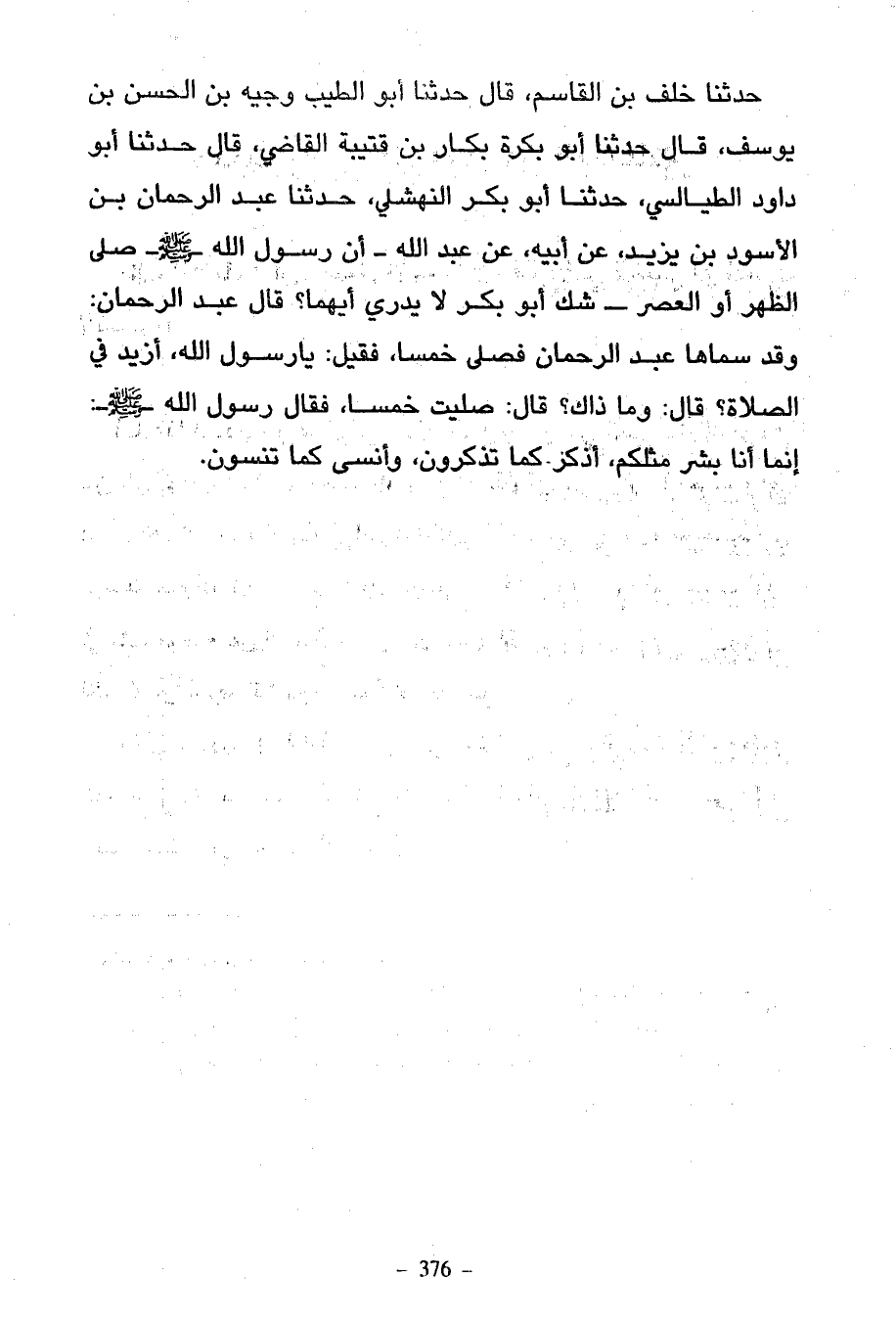 حَدَّثَنَا خَلَفُ بْنُ الْقَاسِمِ قَالَ حَدَّثَنَا أَبُو الطَّيِّبِ وَجِيهُ بْنُ الْحَسَنِ بْنُ يُوسُفَ قَالَ حَدَّثَنَا أَبُو بَكْرَةَ بَكَّارُ بْنُ قُتَيْبَةَ الْقَاضِي قَالَ حَدَّثَنَا أَبُو دَاوُدَ الطَّيَالِسِيُّ حَدَّثَنَا أَبُو بَكْرٍ النَّهْشَلَيُّ حَدَّثَنَا عَبْدِ الرَّحْمَنِ بْنِ الْأَسْوَدِ بْنِ يَزِيدَ عَنْ أَبِيهِ عَنْ عَبْدِ اللَّهِ أَنَّ رَسُولَ اللَّهِ صَلَّى اللَّهُ عليه وسلم صَلَّى الظُّهْرَ أَوِ الْعَصْرَ شَكَّ أَبُو بَكْرٍ لَا يَدْرِي أَيَّهُمَا قَالَ عَبْدُ الرَّحْمَنِ وَقَدْ سَمَّاهَا عَبْدُ الرَّحْمَنِ فَصَلَّى خَمْسًا فَقِيلَ يَا رَسُولَ اللَّهِ أَزِيدَ فِي الصَّلَاةِ قَالَ وَمَا ذَاكَ قَالَ صَلَّيْتَ خَمْسًا فَقَالَ رَسُولُ اللَّهِ صَلَّى اللَّهُ عَلَيْهِ وَسَلَّمَ إِنَّمَا أَنَا بَشَرٌ مِثْلُكُمْ أَذْكُرُ كَمَا تَذْكُرُونَ وَأَنْسَى كَمَا تَنْسَوْنَ