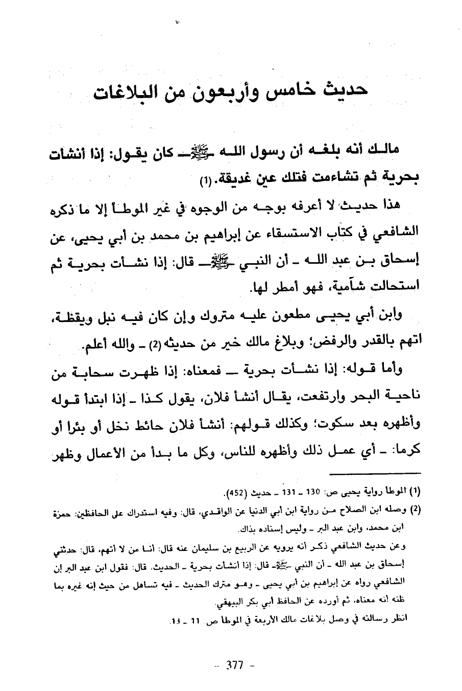 هَذَا حَدِيثٌ لَا أَعْرِفُهُ بِوَجْهٍ مِنَ الْوُجُوهِ فِي غَيْرِ الْمُوَطَّأِ إِلَّا مَا ذَكَرَهُ الشَّافِعِيُّ فِي كِتَابِ الِاسْتِسْقَاءِ عَنْ إِبْرَاهِيمَ بْنِ مُحَمَّدِ بْنِ أَبِي يَحْيَى عَنْ إِسْحَاقَ بْنِ عَبْدِ اللَّهِ أَنَّ النَّبِيَّ صَلَّى اللَّهُ عَلَيْهِ وَسَلَّمَ قَالَ إِذَا نَشَأَتْ بَحْرِيَّةٌ ثُمَّ اسْتَحَالَتْ شَآمِيَّةً فَهُوَ أَمْطَرُ لَهَا