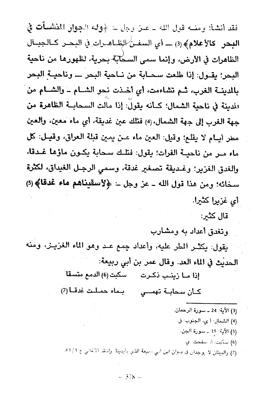فَقَدْ أَنْشَأَ وَمِنْهُ قَوْلُ اللَّهِ عَزَّ وَجَلَّ وَلَهُ الْجِوَارِ الْمُنْشَآتُ فِي الْبَحْرِ كَالْأَعْلَامِ أَيِ السُّفُنُ الظَّاهِرَاتُ فِي الْبَحْرِ كَالْجِبَالِ الظَّاهِرَاتِ فِي الْأَرْضِ وَإِنَّمَا سَمَّى السَّحَابَةَ بَحْرِيَّةً لِظُهُورِهَا مِنْ نَاحِيَةِ الْبَحْرِ يَقُولُ إِذَا طَلَعَتْ سَحَابَةٌ مِنْ نَاحِيَةِ الْبَحْرِ وَنَاحِيَةُ الْبَحْرِ بِالْمَدِينَةِ الْغَرْبُ ثُمَّ تَشَاءَمَتْ أَيْ أَخَذَتْ نَحْوَ الشَّامِ وَالشَّامُ مِنَ الْمَدِينَةِ فِي نَاحِيَةِ الشَّمَالِ كَأَنَّهُ يَقُولُ إِذَا مَالَتِ السَّحَابَةُ الظَّاهِرَةُ مِنْ جِهَةِ الْغَرْبِ إِلَى جِهَةِ الشَّمَالِ فَتِلْكَ عَيْنٌ غَدِيقَةٌ أَيْ مَاءٌ مَعِينٌ وَالْعَيْنُ مَطَرُ أَيَّامٍ لَا يُقْلِعُ وَقِيلَ الْعَيْنُ مَاءٌ عَنْ يَمِينِ قِبْلَةِ الْعِرَاقِ وَقِيلَ كُلُّ مَاءٍ مَرَّ مِنْ نَاحِيَةِ الْفُرَاتِ يَقُولُ فَتِلْكَ سَحَابَةٌ يَكُونُ مَاؤُهَا غَدَقًا وَالْغَدِيقُ الْغَزِيرُ وَغُدَيْقَةٌ تَصْغِيرُ غَدَقَةٍ وَسُمِّي الرَّجُلُ الْغَيْدَاقُ لِكَثْرَةِ سَخَائِهِ وَمِنْ هَذَا قَوْلُ اللَّهِ عَزَّ وَجَلَّ لَأَسْقَيْنَاهُمْ مَاءً غَدَقًا أَيْ غَزِيرًا كَثِيرًا