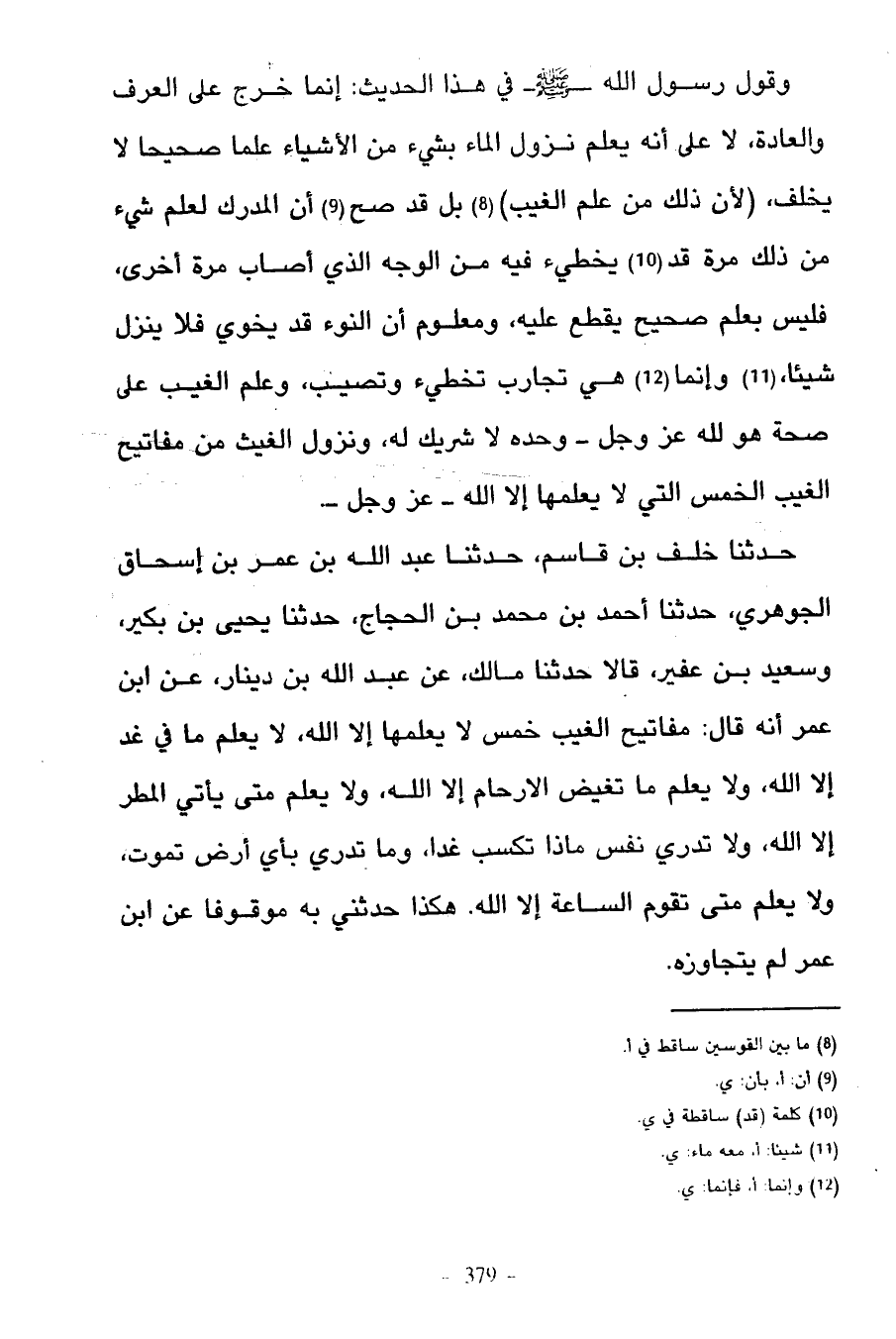 وَقَوْلُ رَسُولِ اللَّهِ صَلَّى اللَّهُ عَلَيْهِ وَسَلَّمَ فِي هَذَا الْحَدِيثِ إِنَّمَا خَرَجَ عَلَى الْعُرْفِ وَالْعَادَةِ لَا عَلَى أَنَّهُ يَعْلَمُ نُزُولَ الْمَاءِ بِشَيْءٍ مِنَ الْأَشْيَاءِ عِلْمًا صَحِيحًا لَا يُخْلَفُ (لِأَنَّ ذَلِكَ مِنْ عِلْمِ الْغَيْبِ) بَلْ قَدْ صَحَّ أَنَّ الْمُدْرِكَ لِعِلْمِ شَيْءٍ مِنْ ذَلِكَ مرة قد يخطيء فِيهِ مِنَ الْوَجْهِ الَّذِي أَصَابَ مَرَّةً أُخْرَى فَلَيْسَ بِعِلْمٍ صَحِيحٍ يُقْطَعُ عَلَيْهِ وَمَعْلُومٌ أَنَّ النَّوْءَ قَدْ يُخْوِي فَلَا يُنْزِلُ شَيْئًا وَإِنَّمَا هِيَ تَجَارِبُ تُخْطِيءُ وَتُصِيبُ وَعِلْمُ الْغَيْبِ عَلَى صِحَّةٍ هُوَ لِلَّهِ عَزَّ وَجَلَّ وَحْدَهُ لَا شَرِيكَ لَهُ وَنُزُولُ الْغَيْثِ مِنْ مَفَاتِيحِ الْغَيْبِ الخمس الَّتِي لَا يَعْلَمُهَا إِلَّا اللَّهُ عَزَّ وَجَلَّ