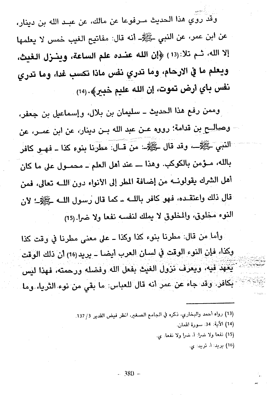 وَمِمَّنْ رَفَعَ هَذَا الْحَدِيثَ سُلَيْمَانُ بْنُ بِلَالٍ وَإِسْمَاعِيلُ بْنُ جَعْفَرٍ وَصَالِحُ بْنُ قُدَامَةَ رَوَوْهُ عَنْ عَبْدِ اللَّهِ بْنِ دِينَارٍ عَنِ ابْنِ عُمَرَ عَنِ النَّبِيِّ صَلَّى اللَّهُ عَلَيْهِ وَسَلَّمَ وَقَدْ قَالَ النَّبِيُّ صَلَّى اللَّهُ عَلَيْهِ وَسَلَّمَ مَنْ قال مطرنا نبوء كَذَا فَهُوَ كَافِرٌ بِاللَّهِ مُؤْمِنٌ بِالْكَوْكَبِ وَهَذَا عِنْدَ أَهْلِ الْعِلْمِ مَحْمُولٌ عَلَى مَا كَانَ أَهْلُ الشِّرْكِ يَقُولُونَهُ مِنْ إِضَافَةِ الْمَطَرِ إِلَى الْأَنْوَاءِ دُونَ اللَّهِ تَعَالَى فَمَنْ قَالَ ذَلِكَ وَاعْتَقَدَهُ فَهُوَ كَافِرٌ بِاللَّهِ كَمَا قَالَ رَسُولُ اللَّهِ صَلَّى اللَّهُ عَلَيْهِ وَسَلَّمَ لِأَنَّ النَّوْءَ مَخْلُوقٌ وَالْمَخْلُوقُ لَا يَمْلِكُ لِنَفْسِهِ نَفْعًا وَلَا ضَرًّا