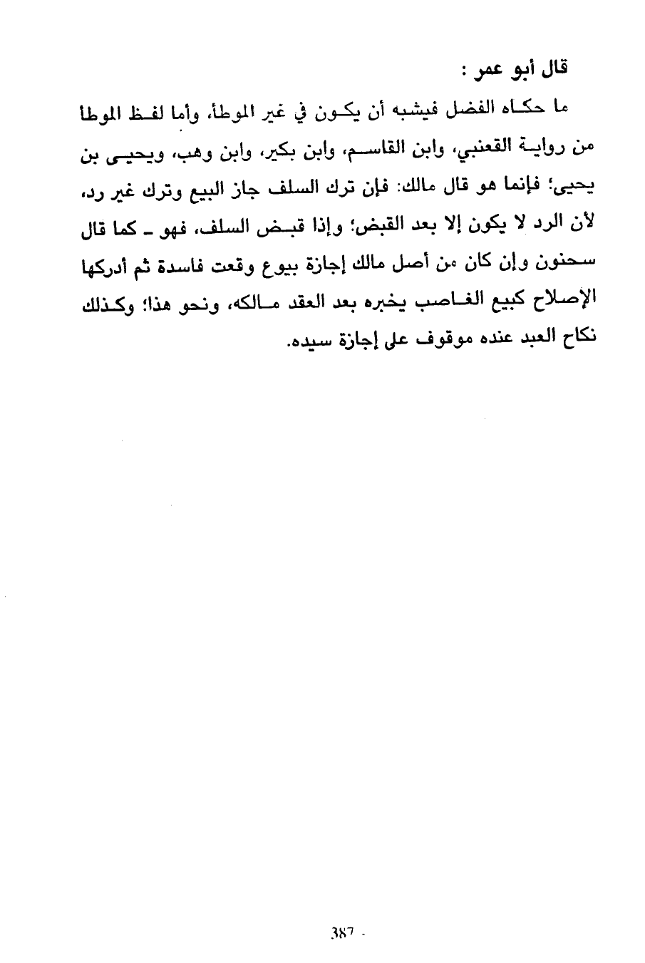 قَالَ أَبُو عُمَرَ مَا حَكَاهُ الْفَضْلُ فَيُشْبِهُ أَنْ يَكُونَ فِي غَيْرِ الْمُوَطَّأِ وَأَمَّا لَفْظُ الْمُوَطَّأِ مِنْ رِوَايَةِ الْقَعْنَبِيِّ وَابْنِ الْقَاسِمِ وَابْنِ بُكَيْرٍ وَابْنِ وَهْبٍ وَيَحْيَى بْنِ يَحْيَى فَإِنَّمَا هُوَ قَالَ مَالِكٌ فَإِنْ تُرِكَ السَّلَفُ جَازَ الْبَيْعُ وَتُرِكَ غَيْرَ رَدٍّ لِأَنَّ الرَّدَّ لَا يَكُونُ إِلَّا بَعْدَ الْقَبْضِ وَإِذَا قُبِضَ السَّلَفُ فَهُوَ كَمَا قَالَ سَحْنُونٌ وَإِنْ كَانَ مِنْ أَصْلِ مَالِكٍ إِجَازَةُ بُيُوعٍ وَقَعَتْ فَاسِدَةً ثُمَّ أَدْرَكَهَا الْإِصْلَاحُ كَبَيْعِ الْغَاصِبِ يُخْبِرُهُ بَعْدَ الْعَقْدِ مَالِكُهُ وَنَحْوِ هَذَا وَكَذَلِكَ نِكَاحُ الْعَبْدِ عِنْدَهُ مَوْقُوفٌ عَلَى إِجَازَةِ سَيِّدِهِ