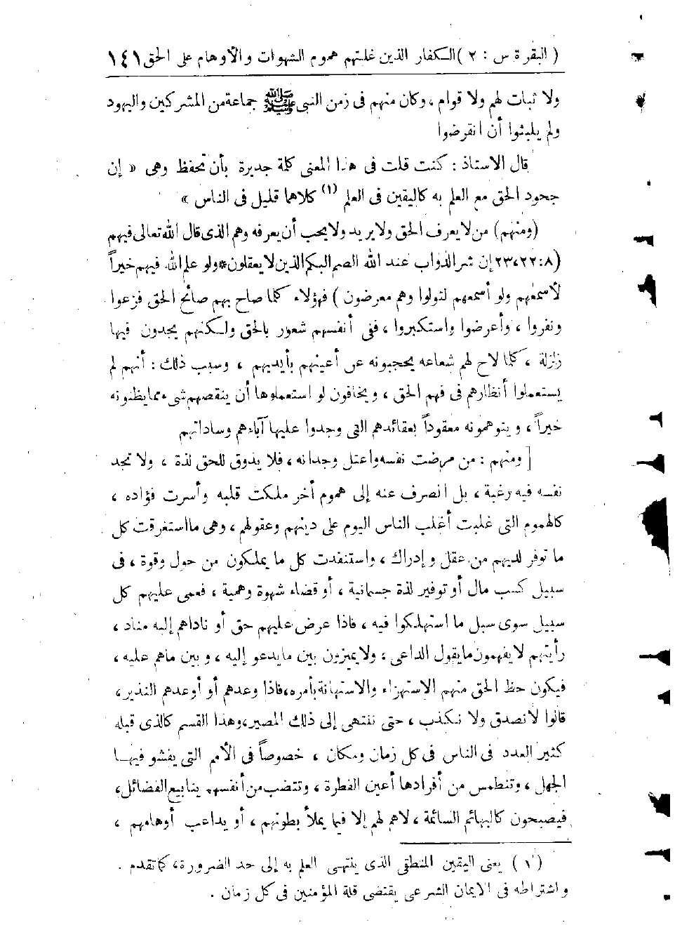 (الْأَوَّلُ) : مَنْ آتَاهُمُ اللهُ دِينًا وَهِدَايَةً عَمِلَ بِهَا سَلَفُهُمْ فَجَنَوْا ثَمَرَهَا، وَصَلَحَ حَالُهُمْ بِهَا أَيَّامَ كَانُوا مُسْتَقِيمِينَ عَلَى الطَّرِيقَةِ، آخِذِينَ بِإِرْشَادِ الْوَحْيِ، وَاقِفِينَ عِنْدَ حُدُودِ الشَّرِيعَةِ، وَلَكِنَّهُمُ انْحَرَفُوا عَنْ سُنَنِ سَلَفِهِمْ فِي الْأَخْذِ بِهَا ظَاهِرًا وَبَاطِنًا، وَلَمْ يَنْظُرُوا فِي حَقَائِقِ مَا جَاءَهُمْ بَلْ ظَنُّوا أَنَّ مَا كَانَ عِنْدَ سَلَفِهِمْ مِنْ نِعْمَةٍ وَسَعَادَةٍ إِنَّمَا كَانَ أَمْرًا خُصُّوا بِهِ، أَوْ خَيْرًا سِيقَ إِلَيْهِمْ، لِظَاهِرِ قَوْلٍ أَوْ عَمَلٍ امْتَازُوا بِهِ عَنْ غَيْرِهِمْ مِمَّنْ لَمْ يَأْخُذْ بِدِينِهِمْ، وَإِنْ كَانَ ذَلِكَ الْعَمَلُ لَمْ يُخَالِطْ سَرَائِرَهُمْ، وَلَمْ تَصْلُحْ بِهِ ضَمَائِرُهُمْ، فَأَخَذُوا بِتَقَالِيدَ وَعَادَاتٍ لَمْ تَدَعْ فِي نُفُوسِهِمْ مَجَالًا لِغَيْرِهَا، وَلِذَلِكَ لَمْ يَتَفَكَّرُوا قَطُّ فِي كَوْنِهِمْ أَحْرَى بِالتَّمَتُّعِ بِتِلْكَ السَّعَادَةِ وَالسِّيَادَةِ مِنْ سَلَفِهِمْ؛ لِأَنَّ حِفْظَ الْمَوْجُودِ أَيْسَرُ مِنْ إِيجَادِ الْمَفْقُودِ، بَلْ لَمْ يُبِيحُوا لِأَنْفُسِهِمْ فَهُمَ الْكِتَابِ الَّذِي اقْتَدَى مِنْ قَبْلِهِمْ بِمَا فِيهِ شُمُوسُ الْعِرْفَانِ وَنُجُومُ الْفُرْقَانِ، لِزَعْمِهِمْ: أَنَّ فَهْمَهُ لَا يَرْتَقِي إِلَيْهِ إِلَّا أَفْرَادٌ مِنْ رُؤَسَاءِ الدِّينِ، يُؤْخَذُ بِأَقْوَالِهِمْ مَا وَجَدُوا، وَبِكُتُبِهِمْ إِذَا فَقَدُوا.