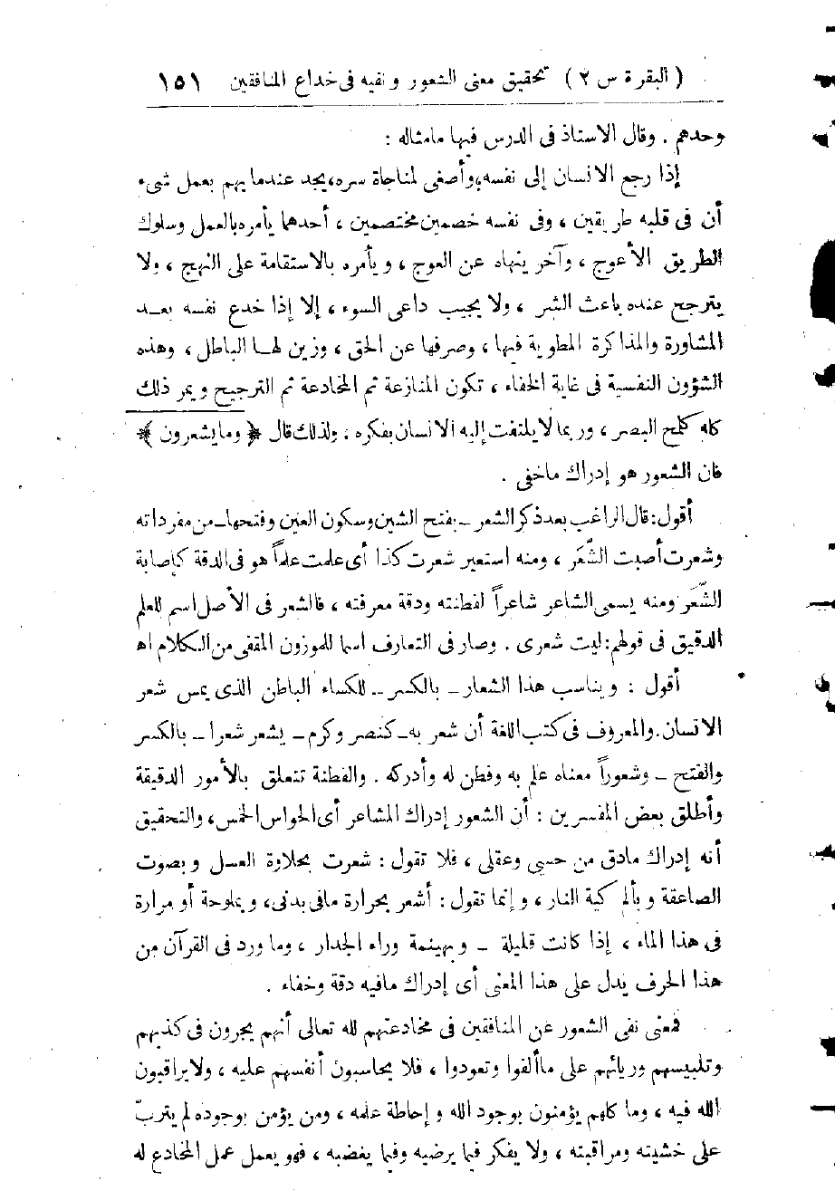 أَحَدُهُمَا: أَنَّهُمُ الَّذِينَ يَقُولُونَ: آمَنَّا بِاللهِ وَبِالْيَوْمِ الْآخِرِ وَمَا هُمْ بِمُؤْمِنِينَ ذَلِكَ الْإِيمَانَ الَّذِي يَمْلِكُ الْقَلْبَ وَيَصْرِفُ النَّفْسَ فِي الْأَعْمَالِ، وَهُوَ الْمَقْبُولُ عِنْدَ اللهِ تَعَالَى، وَإِنَّمَا هُمْ آخِذُونَ بِتَقَالِيدَ ظَاهِرِيَّةٍ لَيْسَ لَهَا ذَلِكَ الْأَثَرُ الصَّالِحُ فِي أَخْلَاقِهِمْ وَأَعْمَالِهِمْ، فَهُمْ يُخَادِعُونَ اللهَ تَعَالَى بِالتَّلَبُّسِ بِبَعْضِ صُوَرِ الْعِبَادَاتِ وَالْأَقْوَالِ وَ ((إِنَّ اللهَ لَا يَنْظُرُ إِلَى صُوَرِكُمْ وَأَمْوَالِكُمْ وَلَكِنْ يَنْظُرُ إِلَى قُلُوبِكُمْ وَأَعْمَالِكُمْ)) وَالْكَلَامُ عَلَى هَذَا لَا يَزَالُ فِي الصِّنْفِ الرَّابِعِ مِنْ أَصْنَافِ الْبَشَرِ الْمُخَاطَبِينَ بِالْقُرْآنِ كَمَا تَقَدَّمَ، فَلَا حَاجَةَ إِلَى بَيَانِ وَجْهِ الِاتِّصَالِ بَيْنَ الْآيَاتِ.