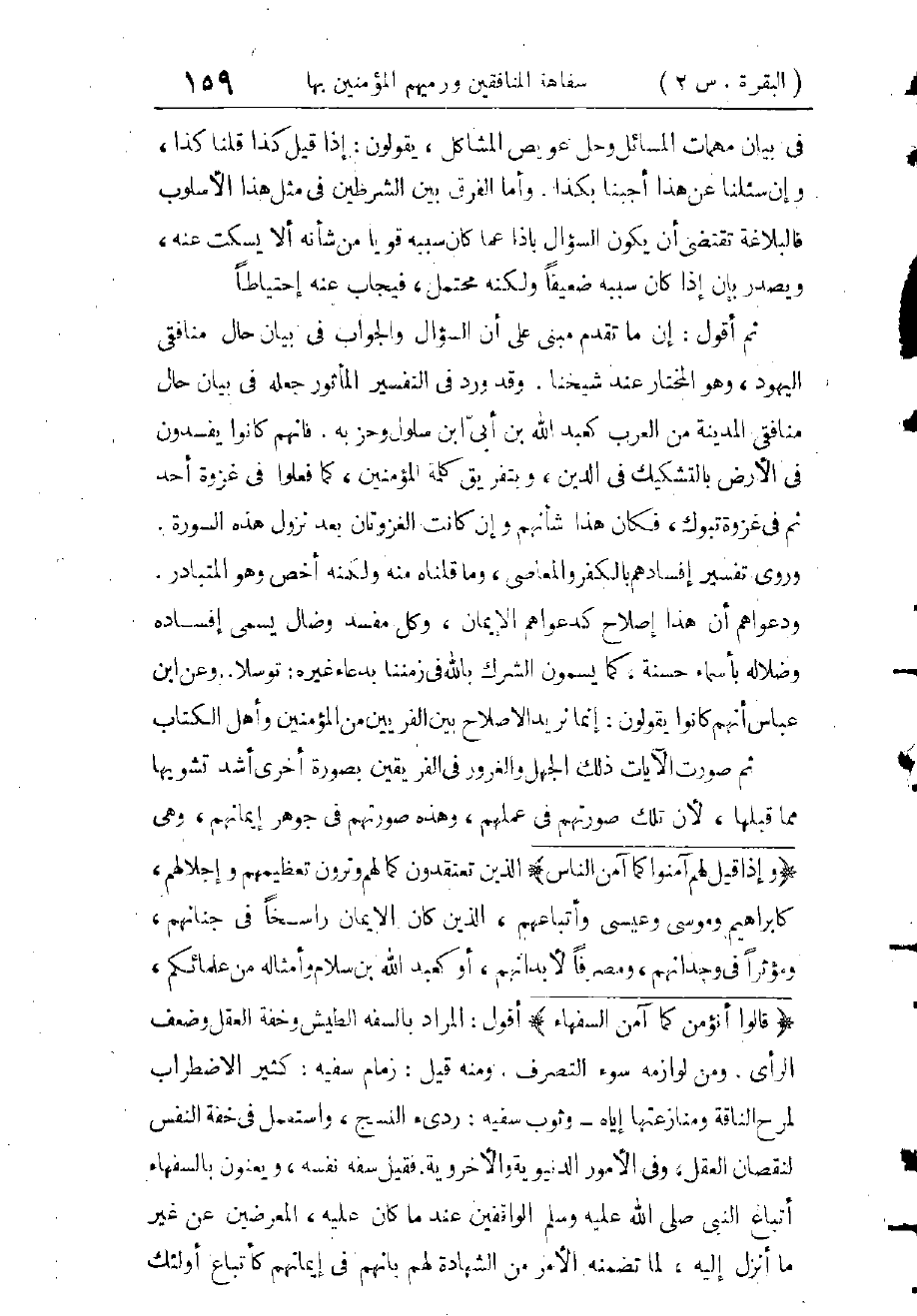 قُلْنَا:إِنَّ الْكَلَامَ مِنْ أَوَّلِ سُورَةٍ فِي الْقُرْآنِ وَتَفْصِيلِ أَحْوَالِ النَّاسِ فِي الْإِيمَانِ بِهِ، وَعَدَمِهِ، وَهَذِهِ الْآيَةُ دَلِيلٌ عَلَى عَدَمِ الْخُرُوجِ عَنْ هَذَا الْمَوْضُوعِ فِي كُلِّ مَا تَقَدَّمَ، فَالْآيَاتُ مُتَّصِلٌ بَعْضُهَا بِبَعْضٍ كَحَبَّاتٍ مِنَ الْجَوْهَرِ نُظِمَتْ فِي سِلْكٍ وَاحِدٍ، فَإِنَّهُ بَعْدَ مَا ذَكَرَ الْمُتَّقِينَ الَّذِينَ يَهْتَدُونَ بِالْقُرْآنِ وَعَلَامَاتِهِمْ، وَبَيْنَ خَصَائِصِهِمْ وَصِفَاتِهِمْ، وَذَكَرَ الْجَاحِدِينَ الْمُعَانِدِينَ، وَمَا هُمْ عَلَيْهِ مِنَ الْعَمَى عَنْ جَلِيَّةِ الْحَقِّ الْمُبِينِ وَمَا رُزِئُوا بِهِ مِنَ الصَّمَمِ الْمَعْنَوِيِّ حَتَّى لَا يَسْمَعُوا الْحُجَجَ وَالْبَرَاهِينَ، وَمَا أُصِيبُوا بِهِ مِنَ الْبُكْمِ بِالنِّسْبَةِ لِقَوْلِ الْحَقِّ أَوْ سُؤَالِ الْمُرْشِدِينَ، ثُمَّ ذَكَرَ الْمُذَبْذَبِينَ بَيْنَ ذَلِكَ فَلَا إِلَى هَؤُلَاءِ وَلَا إِلَى هَؤُلَاءِ، وَذَكَرَ فِرَقَهُمْ وَأَصْنَافَهُمْ، وَبَيَّنَ خَلَائِقَهُمْ وَأَوْصَافَهُمْ، وَضَرَبَ لَهُمُ الْأَمْثَالَ، وَنَضَلَهُمْ فِي مَيْدَانِ الْجِدَالِ بِسِهَامِ الْحُجَجِ النَّافِذَةِ وَسُيُوفِ