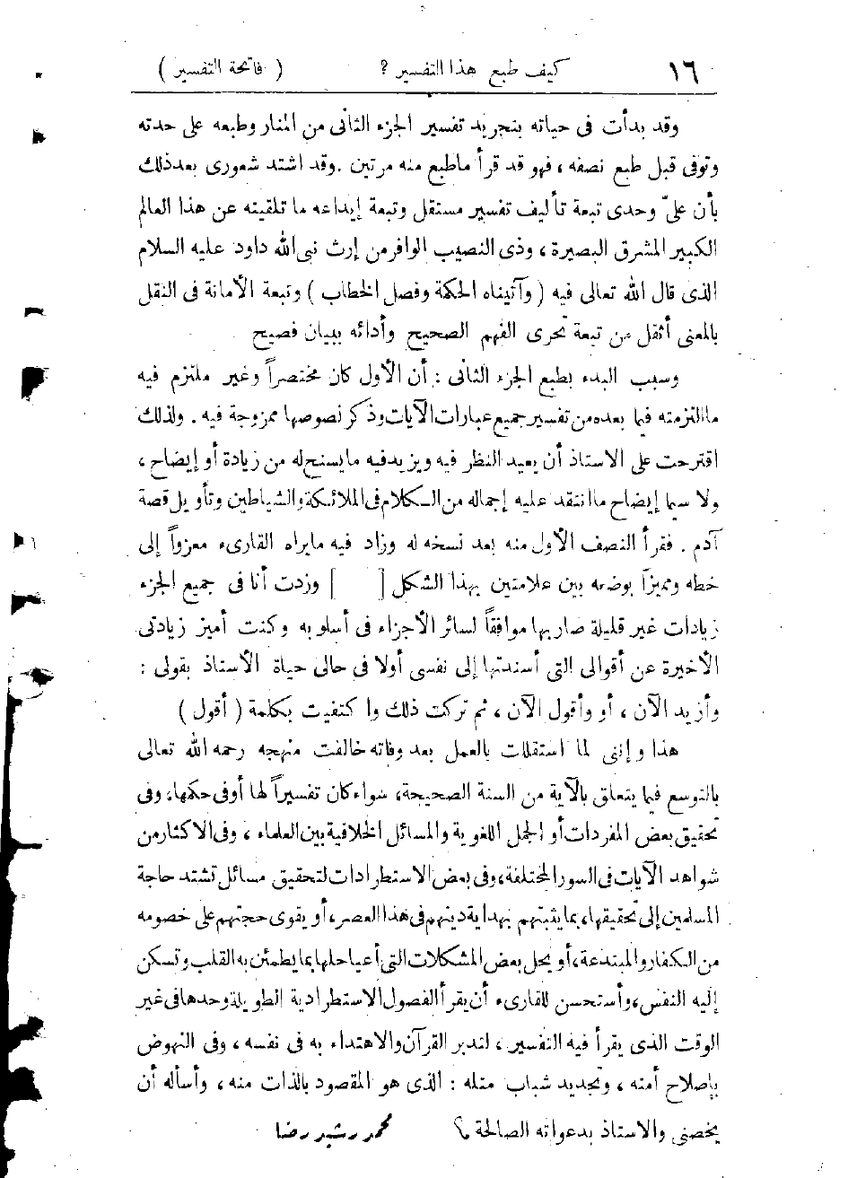 هَذَا وَإِنَّنِي لَمَّا اسْتَقْلَلْتُ بِالْعَمَلِ بَعْدَ وَفَاتِهِ خَالَفْتُ مَنْهَجَهُ - رَحِمَهُ اللهُ تَعَالَى - بِالتَّوَسُّعِ فِيمَا يَتَعَلَّقُ بِالْآيَةِ مِنَ السُّنَّةِ الصَّحِيحَةِ، سَوَاءٌ كَانَ تَفْسِيرًا لَهَا أَوْ فِي حُكْمِهَا، وَفِي تَحْقِيقِ بَعْضِ الْمُفْرَدَاتِ أَوِ الْجُمَلِ اللُّغَوِيَّةِ وَالْمَسَائِلِ الْخِلَافِيَّةِ بَيْنَ الْعُلَمَاءِ، وَفِي الْإِكْثَارِ مِنْ شَوَاهِدِ الْآيَاتِ فِي السُّوَرِ الْمُخْتَلِفَةِ، وَفِي بَعْضِ الِاسْتِطْرَادَاتِ لِتَحْقِيقِ مَسَائِلَ تَشْتَدُّ حَاجَةُ الْمُسْلِمِينَ إِلَى تَحْقِيقِهَا، بِمَا يُثَبِّتُهُمْ بِهِدَايَةِ دِينِهِمْ فِي هَذَا الْعَصْرِ، أَوْ يُقَوِّي حُجَّتَهُمْ عَلَى خُصُومِهِ مِنَ الْكُفَّارِ وَالْمُبْتَدِعَةِ، أَوْ يَحِلُّ بَعْضَ الْمُشْكِلَاتِ الَّتِي أَعْيَا حَلُّهَا بِمَا يَطْمَئِنُّ بِهِ الْقَلْبُ وَتَسْكُنُ إِلَيْهِ النَّفْسُ، وَأَسْتَحْسَنُ لِلْقَارِئِ أَنْ يَقْرَأَ الْفُصُولَ الِاسْتِطْرَادِيَّةَ الطَّوِيلَةَ وَحْدَهَا فِي غَيْرِ الْوَقْتِ الَّذِي يَقْرَأُ فِيهِ التَّفْسِيرَ لِتَدَبُّرِ الْقُرْآنِ وَالِاهْتِدَاءِ بِهِ فِي نَفْسِهِ، وَفِي النُّهُوضِ بِإِصْلَاحِ أُمَّتِهِ وَتَجْدِيدِ شَبَابِ مِلَّتِهِ الَّذِي هُوَ الْمَقْصُودُ بِالذَّاتِ مِنْهُ، وَأَسْأَلُهُ أَنْ يَخُصَّنِي وَالْأُسْتَاذَ بِدَعَوَاتِهِ الصَّالِحَةِ.