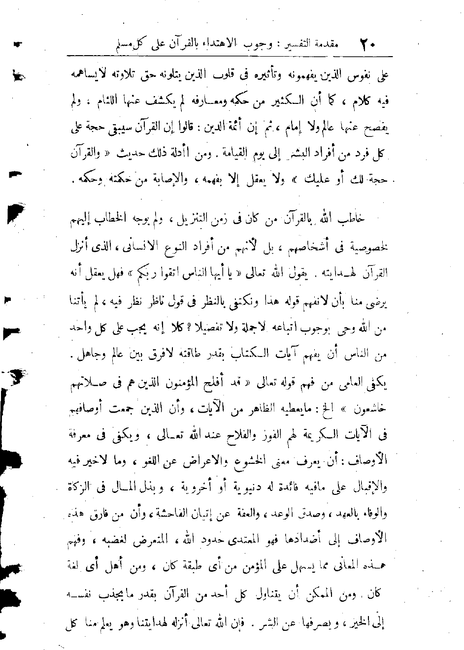 آخِرَ الْكُتُبِ، وَبَيَّنَ فِيهِ مَا لَمْ يُبَيِّنْهُ فِي غَيْرِهِ. بَيَّنَ فِيهِ كَثِيرًا مِنْ أَحْوَالِ الْخَلْقِ وَطَبَائِعِهِمْ وَالسُّنَنَ الْإِلَهِيَّةَ فِي الْبَشَرِ، قَصَّ عَلَيْنَا أَحْسَنَ الْقَصَصِ عَنِ الْأُمَمِ وَسِيَرِهَا الْمُوَافَقَةِ لِسُنَّتِهِ فِيهَا. فَلَا بُدَّ لِلنَّاظِرِ فِي هَذَا الْكِتَابِ مِنَ النَّظَرِ فِي أَحْوَالِ الْبَشَرِ فِي أَطْوَارِهِمْ وَأَدْوَارِهِمْ، وَمَنَاشِئِ اخْتِلَافِ أَحْوَالِهِمْ، مِنْ قُوَّةٍ