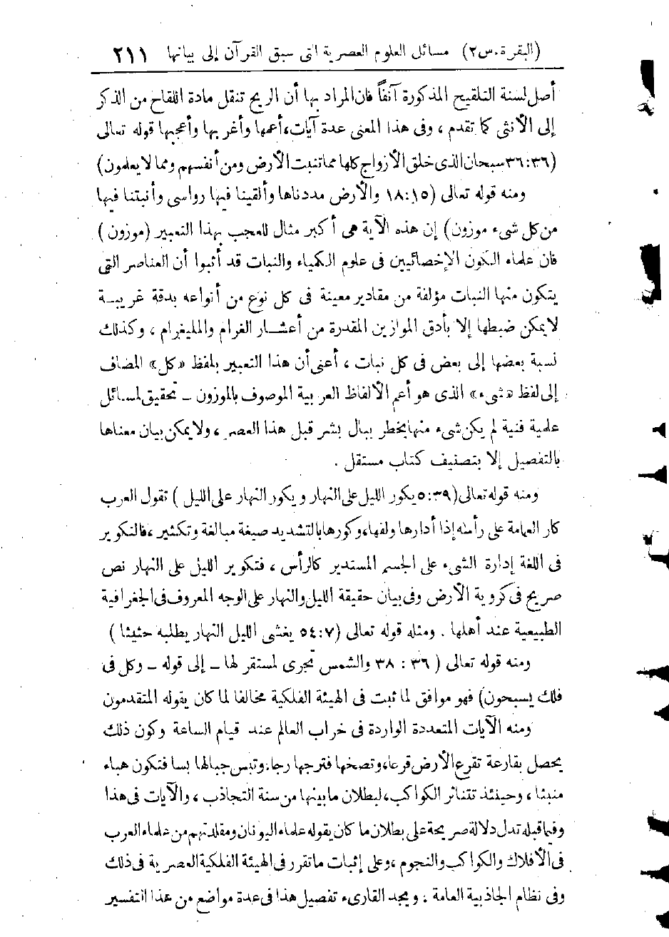 فَنَحْنُ قَدْ سَمِعْنَا بِآذَانِنَا شُبْهَاتٍ عَلَى بَعْضِ الْآيَاتِ وَالْأَحَادِيثِ لَمْ يَسْهُلْ عَلَيْنَا دَفْعُهَا وَإِقْنَاعُ أَصْحَابِهَا بِصِدْقِ كَلَامِ اللهِ وَكَلَامِ رَسُولِهِ إِلَّا بِضَرْبٍ مِنَ التَّأْوِيلِ، وَأَمْثَالٍ تُقَرِّبُهَا مِنْ عُقُولِهِمْ وَمَعْلُومَاتِهِمْ أَحْسَنَ التَّقْرِيبِ، وَقَدْ غَلِطَ كَثِيرٌ مِنْ عُلَمَاءِ الْكَلَامِ وَالْمُفَسِّرِينَ فِي بَيَانِ مَذْهَبِ السَّلَفِ وَفِي مَعَانِي التَّفْوِيضِ وَالتَّأْوِيلِ، وَتَجِدُ تَفْصِيلَ ذَلِكَ لَنَا فِي أَوَائِلِ تَفْسِيرِ سُورَةِ آلِ عِمْرَانَ، كَمَا أَخْطَأَ مَنْ قَالُوا: إِنَّ الدَّلِيلَ الْعَقْلِيَّ هُوَ الْأَصْلُ فَيُرَدُّ إِلَيْهِ الدَّلِيلُ السَّمْعِيُّ وَيَجِبُ تَأْوِيلُهُ لِأَجْلِ مُوَافَقَتِهِ مُطْلَقًا، وَالْحَقُّ كَمَا قَالَ شَيْخُ الْإِسْلَامِ ابْنُ تَيْمِيَةَ: إِنَّ كُلًّا مِنَ الدَّلِيلَيْنِ إِمَّا قَطْعِيٌّ وَإِمَّا غَيْرُ قَطْعِيٍّ، فَالْقَطْعِيَّانِ لَا يُمْكِنُ أَنْ يَتَعَارَضَا حَتَّى نُرَجِّحَ أَحَدَهُمَا عَلَى الْآخَرِ، وَإِذَا تَعَارَضَ ظَنِّيٌّ مِنْ كُلٍّ مِنْهُمَا مَعَ قَطْعِيٍّ وَجَبَ تَرْجِيحُ الْقَطْعِيِّ مُطْلَقًا، وَإِذَا تَعَارَضَ ظَنِّيٌّ مَعَ ظَنِّيٍّ مِنْ كُلٍّ مِنْهَا رَجَّحْنَا الْمَنْقُولَ عَلَى الْمَعْقُولِ؛ لِأَنَّ مَا نُدْرِكُهُ بِغَلَبَةِ الظَّنِّ مِنْ كَلَامِ اللهِ وَرَسُولِهِ أَوْلَى بِالِاتِّبَاعِ مِمَّا نُدْرِكُهُ بِغَلَبَةِ الظَّنِّ مِنْ نَظَرِيَّاتِنَا الْعَقْلِيَّةِ الَّتِي يَكْثُرُ فِيهَا الْخَطَأُ جِدًّا؛ فَظَوَاهِرُ الْآيَاتِ فِي خَلْقِ آدَمَ مَثَلًا مُقَدَّمٌ فِي الِاعْتِقَادِ عَلَى النَّظَرِيَّاتِ الْمُخَالِفَةِ لَهَا مِنْ أَقْوَالِ الْبَاحِثِينَ فِي أَسْرَارِ الْخَلْقِ وَتَعْلِيلِ أَطْوَارِهِ وَنِظَامِهِ مَا دَامَتْ ظَنِّيَّةً لَمْ تَبْلُغْ دَرَجَةَ الْقَطْعِ.