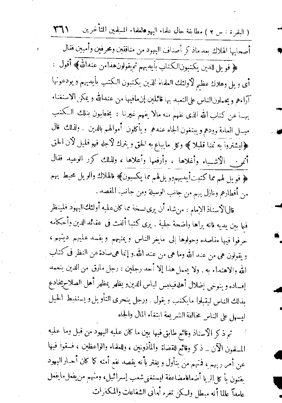 وَأَمَّا قَوْلُهُ: (وَإِذَا قَضَى أَمْرًا فَإِنَّمَا يَقُولُ لَهُ كُنْ فَيَكُونُ) فَمَعْنَاهُ: أَنَّهُ إِذَا أَرَادَ إِيجَادَ أَمْرٍ وَإِحْدَاثَهُ، فَإِنَّمَا يَأْمُرُهُ أَنْ يَكُونَ مَوْجُودًا، فَيَكُونُ مَوْجُودًا، فَكُنْ وَيَكُونُ مِنْ كَانَ التَّامَّةِ. وَقَدْ ذَهَبَ جُمْهُورُ الْعُلَمَاءِ إِلَى أَنَّ هَذَا ضَرْبٌ مِنَ التَّمْثِيلِ، أَيْ أَنَّ تَعَلُّقَ إِرَادَتِهِ - تَعَالَى - بِإِيجَادِ الشَّيْءِ يَعْقُبُهُ وَجُودُهُ، كَأَمْرٍ يَصْدُرُ فَيَعْقُبُهُ الِامْتِثَالُ، فَلَيْسَ بَعْدَ الْإِرَادَةِ إِلَّا حُصُولُ الْمُرَادِ. وَقَالَ بَعْضُهُمْ: بَلْ هُوَ قَوْلٌ حَقِيقِيٌّ. قَالَ الْأُسْتَاذُ الْإِمَامُ: وَقَدْ وَقَعَ هَذَا الْخِلَافُ مِنْ أَهْلِ السُّنَّةِ وَغَيْرِهِمْ، وَعَجِيبٌ وُقُوعُهُ مِنْهُمْ، فَإِنَّ عِنْدَهُمْ مَذْهَبَيْنِ فِي الْمُتَشَابِهَاتِ الَّتِي يَسْتَحِيلُ حَمْلُهَا عَلَى ظَاهِرِهَا، وَهُمَا: مَذْهَبُ السَّلَفِ فِي التَّفْوِيضِ، وَمَذْهَبُ الْخَلَفِ فِي التَّأْوِيلِ، وَظَاهِرٌ أَنَّ هَذَا مِنَ الْمُتَشَابِهِ، وَالْقَاعِدَةُ فِي تَأْوِيلِ مِثْلِهِ مَعْرُوفَةٌ وَمُتَّفَقٌ عَلَيْهَا، وَهِيَ إِرْجَاعُ النَّقْلِيِّ إِلَى الْعَقْلِيِّ؛ لِأَنَّهُ الْأَصْلُ، وَهَاهُنَا يَقُولُونَ: إِنَّ الْأَمْرَ بِمَعْنَى تَعَلُّقِ الْإِرَادَةِ وَأَنَّ مَعْنَى (يَكُونُ) يُوجَدُ.