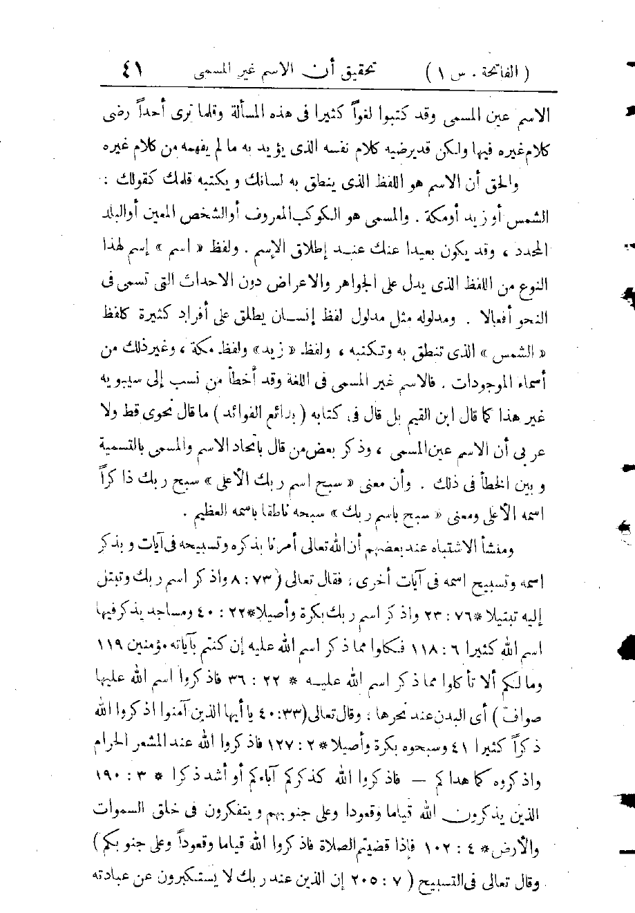 (الْحَمْدُ لِلَّهِ رَبِّ الْعَالَمِينَ الرَّحْمَنِ الرَّحِيمِ قَالُوا: إِنَّ مَعْنَى الْحَمْدِ الثَّنَاءُ بِاللِّسَانِ، وَقَيَّدُوهُ بِالْجَمِيلِ؛ لِأَنَّ كَلِمَةَ " ثَنَاءٍ " تُسْتَعْمَلُ فِي الْمَدْحِ وَالذَّمِّ جَمِيعًا، يُقَالُ: أَثْنَى عَلَيْهِ شَرًّا، كَمَا يُقَالُ: أَثْنَى عَلَيْهِ خَيْرًا. وَيَقُولُونَ: إِنَّ " أل " الَّتِي فِي الْحَمْدِ هِيَ لِلْجِنْسِ فِي أَيِّ فَرَدٍ مِنْ أَفْرَادِهِ لَا لِلِاسْتِغْرَاقِ وَلَا لِلْعَهْدِ الْمَخْصُوصِ؛ لِأَنَّهُ لَا يُصَارُ إِلَى كُلٍّ مِنْهُمَا فِي فَهْمِ الْكَلَامِ إِلَّا بِالْبَدِيلِ، وَهُوَ غَيْرُ مَوْجُودٍ فِي الْآيَةِ، وَمَعْنَى كَوْنِ الْحَمْدِ لِلَّهِ تَعَالَى بِأَيِّ نَوْعٍ مِنْ أَنْوَاعِهِ، هُوَ أَنَّ أَيَّ شَيْءٍ يَصِحُّ الْحَمْدُ عَلَيْهِ فَهُوَ مَصْدَرُهُ، وَإِلَيْهِ مَرْجِعُهُ، فَالْحَمْدُ لَهُ عَلَى كُلِّ حَالٍ.