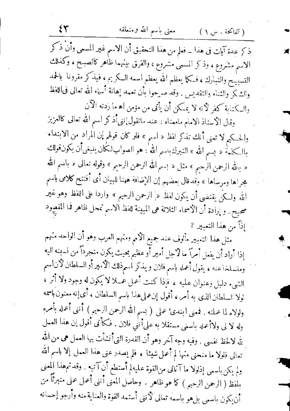 أَقُولُ الْآنَ: إِنَّنِي لَا أَرَى وَجْهًا لِلْبَحْثِ فِي عَدِّ ذِكْرِ " الرَّحْمَنِ الرَّحِيمِ " فِي سُورَةِ الْفَاتِحَةِ تَكْرَارًا أَوْ إِعَادَةً مُطْلَقًا، أَمَّا عَلَى الْقَوْلِ بِأَنَّ الْبَسْمَلَةَ لَيْسَتْ آيَةً مِنْهَا فَظَاهِرٌ، وَأَمَّا عَلَى الْقَوْلِ بِأَنَّهَا آيَةٌ مِنْهَا فَيَحْتَاجُ إِلَى بَيَانٍ، وَهُوَ أَنَّ جَعْلَهَا آيَةً مِنْهَا وَمِنْ كُلِّ سُورَةٍ يُرَادُ بِهِ مَا تَقَدَّمَ شَرْحُهُ آنِفًا مِنْ أَنَّ النَّبِيَّ - صَلَّى اللَّهُ عَلَيْهِ وَسَلَّمَ - كَانَ يُلَقِّنُهَا وَيُبَلِّغُهَا لِلنَّاسِ عَلَى أَنَّهَا (أَيِ السُّورَةُ) مُنَزَّلَةٌ مِنْ عِنْدِ اللهِ تَعَالَى أَنْزَلَهَا بِرَحْمَتِهِ لِهِدَايَةِ خَلْقِهِ، وَأَنَّهُ - صَلَّى اللَّهُ عَلَيْهِ وَسَلَّمَ - لَا كَسْبَ لَهُ فِيهَا وَلَا صُنْعَ، وَإِنَّمَا هُوَ مُبَلِّغٌ لَهَا بِأَمْرِ اللهِ تَعَالَى. فَهِيَ مُقَدِّمَةٌ لِلسُّوَرِ كُلِّهَا إِلَّا سُورَةَ بَرَاءَةَ الْمُنَزَّلَةَ بِالسَّيْفِ، وَكَشْفِ السِّتَارِ عَنْ نِفَاقِ الْمُنَافِقِينَ، فَهِيَ بَلَاءٌ عَلَى مَنْ أُنْزِلَ أَكْثَرُهَا فِي شَأْنِهِمْ لَا رَحْمَةً بِهِمْ. وَإِذَا كَانَ الْمُرَادُ بِبَدْءِ الْفَاتِحَةِ بِالْبَسْمَلَةِ أَنَّهَا مُنَزَّلَةٌ مِنَ اللهِ رَحْمَةً بِعِبَادِهِ فَلَا يُنَافِي ذَلِكَ أَنْ يَكُونَ مِنْ مَوْضُوعِ هَذِهِ السُّورَةِ بَيَانُ رَحْمَةِ اللهِ تَعَالَى مَعَ بَيَانِ رُبُوبِيَّتِهِ لِلْعَالَمِينَ، وَكَوْنِهِ الْمَلِكَ الَّذِي يَمْلِكُ وَحْدَهُ جَزَاءَ الْعَامِلِينَ عَلَى أَعْمَالِهِمْ، وَأَنَّهُ بِهَذِهِ الْأَسْمَاءِ وَالصِّفَاتِ كَانَ