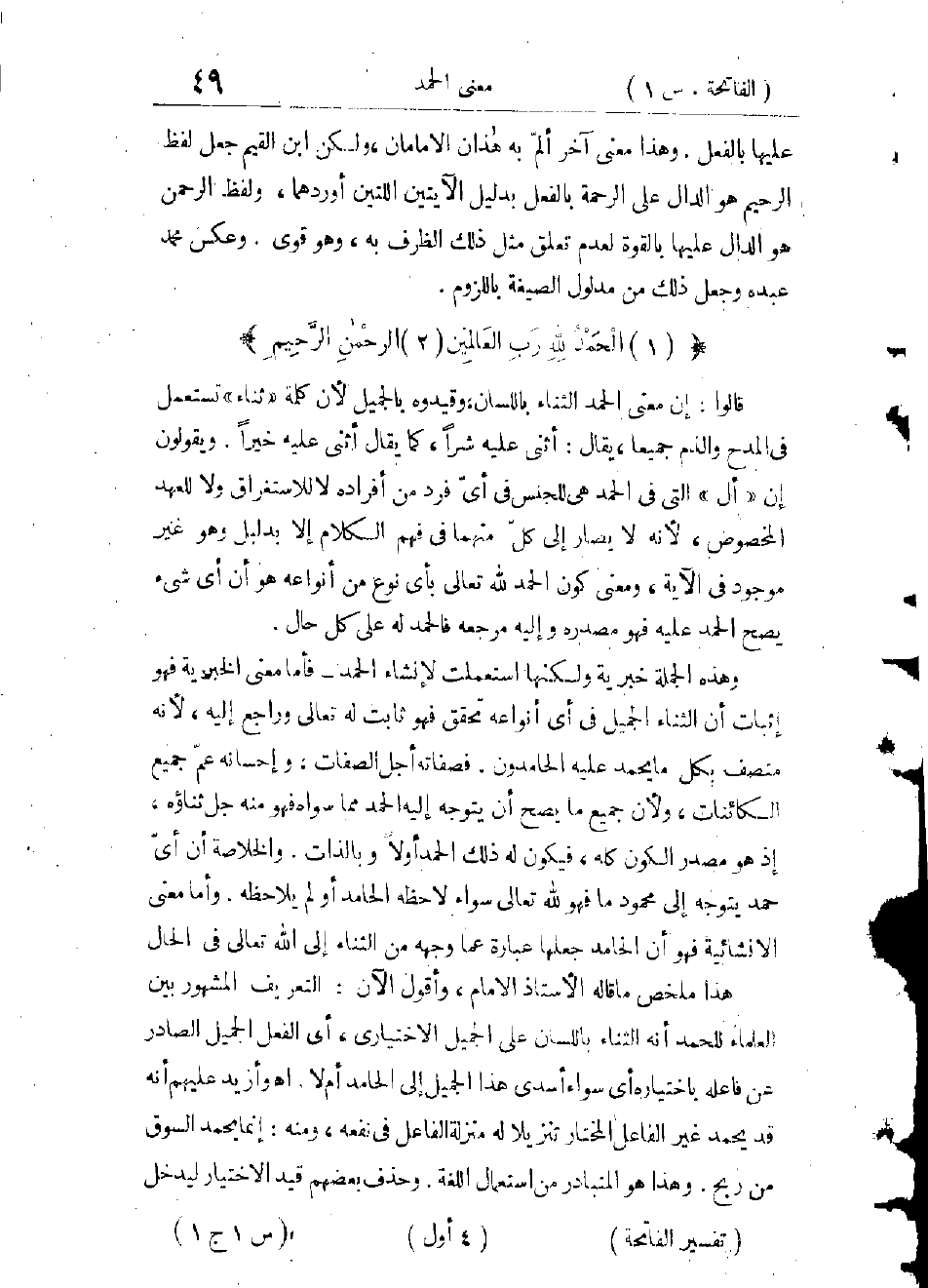 وَالْمُوَاصَلَةِ لِثَمَرَتِهِ مِنْهُ سُبْحَانَهُ دُونَ سِوَاهُ، إِذْ لَا يَقْدِرُ عَلَى مَا وَرَاءَ الْأَسْبَابِ الْمَمْنُوحَةِ لِكُلِّ الْبِشْرِ عَلَى السَّوَاءِ إِلَّا مُسَبِّبُ الْأَسْبَابِ، وَرَبُّ الْأَرْبَابِ، فَقَوْلُهُ تَعَالَى: " (وَإِيَّاكَ نَسْتَعِينُ " مُتَمِّمٌ لِمَعْنَى قَوْلِهِ: " (إِيَّاكَ نَعْبُدُ " لِأَنَّ الِاسْتِعَانَةَ بِهَذَا الْمَعْنَى فَزَعٌ مِنَ الْقَلْبِ إِلَى اللهِ وَتَعَلُّقٌ مِنَ النَّفْسِ بِهِ، وَذَلِكَ مِنْ مُخِّ الْعِبَادَةِ، فَإِذَا تَوَجَّهَ الْعَبْدُ بِهَا إِلَى غَيْرِ اللهِ تَعَالَى كَانَ ضَرْبًا مِنْ ضُرُوبِ الْعِبَادَةِ الْوَثَنِيَّةِ الَّتِي كَانَتْ ذَائِعَةً فِي زَمَنِ التَّنْزِيلِ وَقَبْلَهُ، وَخُصَّتْ بِالذِّكْرِ لِئَلَّا يَتَوَهَّمَ الْجُهَلَاءُ أَنَّ الِاسْتِعَانَةَ بِمَنِ اتَّخَذُوهُمْ أَوْلِيَاءَ مَنْ دُونِ اللهِ، وَاسْتَعَانُوا بِهِمْ فِيمَا وَرَاءَ الْأَسْبَابِ الْمُكْتَسِبَةِ لِعَامَّةِ النَّاسِ، هِيَ كَالِاسْتِعَانَةِ بِسَائِرِ النَّاسِ فِي الْأَسْبَابِ الْعَامَّةِ، فَأَرَادَ الْحَقُّ جَلَّ شَأْنُهُ أَنْ يَرْفَعَ هَذَا اللَّبْسَ عَنْ عِبَادِهِ بِبَيَانِ أَنَّ الِاسْتِعَانَةَ بِالنَّاسِ فِيمَا هُوَ فِي اسْتِطَاعَةِ النَّاسِ إِنَّمَا هُوَ ضَرْبٌ مِنَ اسْتِعْمَالِ الْأَسْبَابِ الْمَسْنُونَةِ، وَمَا مَنْزِلَتُهَا إِلَّا كَمَنْزِلَةِ الْآلَاتِ فِيمَا هِيَ آلَاتٌ لَهُ، بِخِلَافِ الِاسْتِعَانَةِ بِهِمْ فِي شُئُونٍ تَفُوقُ الْقُدْرَةَ وَالْقُوَى الْمَوْهُوبَةَ لَهُمْ، وَالْأَسْبَابَ الْمُشْتَرِكَةَ بَيْنَهُمْ، كَالِاسْتِعَانَةِ فِي شِفَاءِ الْمَرَضِ بِمَا وَرَاءَ الدَّوَاءِ، وَعَلَى غَلَبَةِ الْعَدُوِّ بِمَا وَرَاءَ الْعُدَّةِ وَالْعِدَّةِ، فَإِنَّ ذَلِكَ مِمَّا لَا يَجُوزُ الْفَزَعُ وَالتَّوَجُّهُ فِيهِ إِلَى غَيْرِ اللهِ تَعَالَى صَاحِبِ السُّلْطَانِ الْأَعْظَمِ، عَلَى مَا لَا يَصِلُ إِلَيْهِ سُلْطَانُ أَحَدٍ مِنَ الْعَالَمِ: