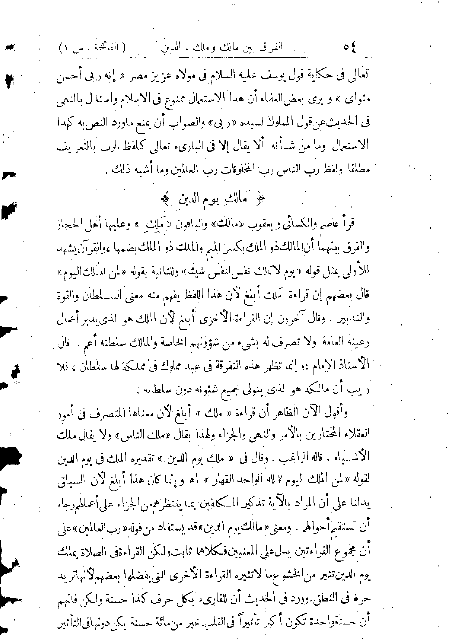 ثُمَّ بَيَّنَ مَعْنَى الصِّرَاطِ (وَهُوَ الطَّرِيقُ) وَاشْتِقَاقُهُ، وَقِرَاءَةُ الصِّرَاطِ بِالسِّينِ الْمُهْمَلَةِ وَاشْتِقَاقُهَا عَلَى نَحْوِ مَا فِي كُتُبِ اللُّغَةِ وَالتَّفْسِيرِ، وَمَعْنَى الْمُسْتَقِيمِ: وَهُوَ ضِدُّ الْمُعْوَجِّ، وَقَالَ: لَيْسَ الْمُرَادُ بِمُقَابِلِ الْمُسْتَقِيمِ الْمُعْوَجَّ ذَا التَّمَوُّجِ وَالتَّعَارِيجِ، بَلِ الْمُرَادُ: كُلُّ مَا فِيهِ انْحِرَافٌ عَنِ الْغَايَةِ الَّتِي يَجِبُ أَنْ يَنْتَهِيَ سَالِكُهُ إِلَيْهَا. وَالْمُسْتَقِيمُ فِي عُرْفِ الْهَنْدَسَةِ: أَقْرَبُ مُوَصِّلٍ بَيْنَ طَرَفَيْنِ، وَهَذَا الْمَعْنَى لَازِمٌ لِلْمَعْنَى اللُّغَوِيِّ كَمَا هُوَ ظَاهِرٌ بِالْبَدَاهَةِ. وَإِنَّمَا قُلْنَا: إِنَّ الْمُرَادَ بِمُقَابِلِ الْمُسْتَقِيمِ كُلُّ مَا فِيهِ انْحِرَافٌ؛ لِأَنَّ كُلَّ مَنْ يَمِيلُ وَيَنْحَرِفُ عَنِ الْجَادَّةِ يَكُونُ أَضَلَّ عَنِ الْغَايَةِ مِمَّنْ يَسِيرُ عَلَيْهَا فِي خَطٍّ ذِي تَعَارِيجَ؛ لِأَنَّ هَذَا الْأَخِيرَ قَدْ يَصِلُ إِلَى الْغَايَةِ بَعْدَ زَمَنٍ طَوِيلٍ. وَلَكِنَّ الْأَوَّلَ لَا يَصِلُ إِلَيْهَا أَبَدًا. بَلْ يَزْدَادُ عَنْهَا بُعْدًا كُلَّمَا أَوْغَلَ فِي السَّيْرِ وَانْهَمَكَ فِيهِ.