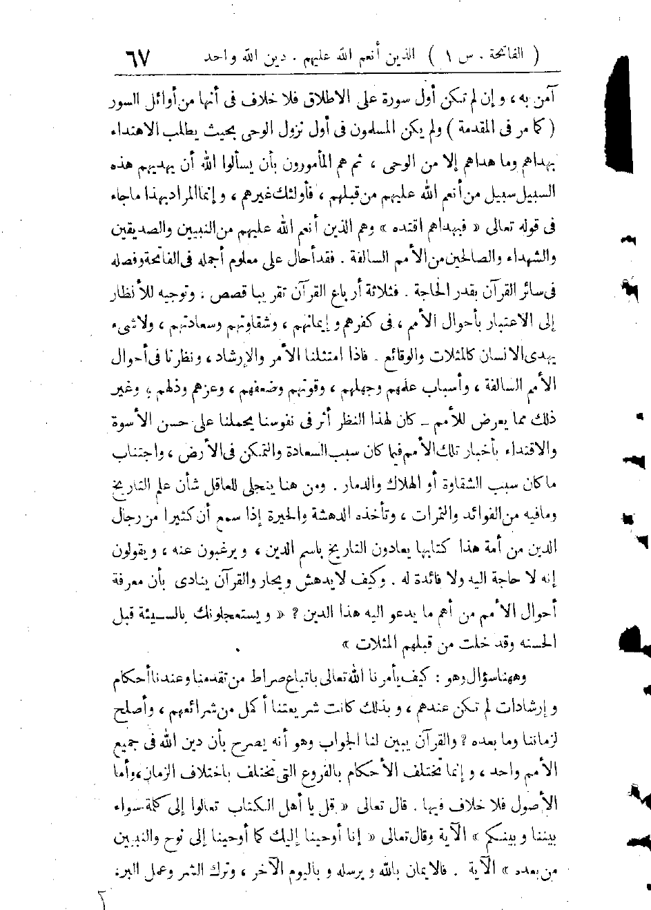 (4) أَنَّهُ اسْتَبْدَلَ كَلِمَةَ (الدَّيَّانِ) بِكَلِمَةِ (يَوْمِ الدِّينِ) وَهِيَ لَا تَقُومُ مَقَامَهَا، وَلَا تُفِيدُ مَا فِيهَا مِنَ الْمَعَانِي الْمَطْلُوبَةِ لِذَاتِهَا، فَإِنَّ لِلدَّيَّانِ فِي اللُّغَةِ مَعَانِيَ مِنْهَا الْقَاضِي وَالْحَاسِبُ أَوِ الْمُحَاسِبُ وَالْقَاهِرُ. وَغَايَةُ مَا يُفِيدُهُ وَصْفُ الرَّبِّ بِأَنَّهُ حَاكِمٌ يَدِينُ عِبَادَهُ وَيَجْزِيهِمْ. وَأَمَّا يَوْمُ الدِّينِ: فَإِنَّهُ اسْمٌ لِيَوْمٍ مُعَيَّنٍ مَوْصُوفٍ فِي كِتَابِ اللهِ بِأَوْصَافٍ عَظِيمَةٍ هَائِلَةٍ، يُحَاسِبُ اللهُ فِيهِ الْخَلَائِقَ وَيَحْكُمُ بَيْنَهُمْ وَيَجْزِيهِمْ، وَالْإِيمَانُ بِهَذَا الْيَوْمِ رُكْنٌ مِنْ أَرْكَانِ الدِّينِ، وَإِضَافَةُ مَلِكٍ وَمَالِكٍ إِلَيْهِ تُفِيدُ أَنَّ الْأَمْرَ كُلَّهُ فِي ذَلِكَ الْيَوْمِ لَهُ وَحْدَهُ فَلَا يَمْلِكُ أَحَدٌ لِأَحَدٍ فِيهِ شَيْئًا مِنْ نَفْعٍ وَلَا مِنْ كَشْفِ ضُرٍّ كَمَا تَقَدَّمَ تَفْصِيلُهُ فِي تَفْسِيرِ الْآيَةِ - فَاسْتِحْضَارُ هَذِهِ الْمَعَانِي فِي النَّفْسِ لَهُ مِنَ التَّأْثِيرِ الْمُقَوِّي لِعَقِيدَةِ التَّوْحِيدِ الْمُرَغِّبِ فِي الْعَمَلِ الصَّالِحِ الْمُرَهِّبِ الزَّاخِرِ عَنِ الشَّرِّ، مَا لَيْسَ لِاسْمِ الدَّيَّانِ وَحْدَهُ، وَيَكْفِي الْإِنْسَانَ فِي الْجَزْمِ بِهَذَا مُشَاوَرَةُ فِكْرِهِ، وَمُرَاجَعَةُ وِجْدَانِهِ، وَإِنْ لَمْ يَكُنْ يَعْلَمُ مِنْ فُنُونِ الْبَلَاغَةِ شَيْئًا، وَهَلْ لِهَذَا الْمُبَشِّرِ الْمُتَعَصِّبِ فِكْرٌ وَوِجْدَانٌ يَهْدِيَانِهِ إِلَى مَا يَجْهَلُ مِنْ بَلَاغَةِ الْقُرْآنِ؟