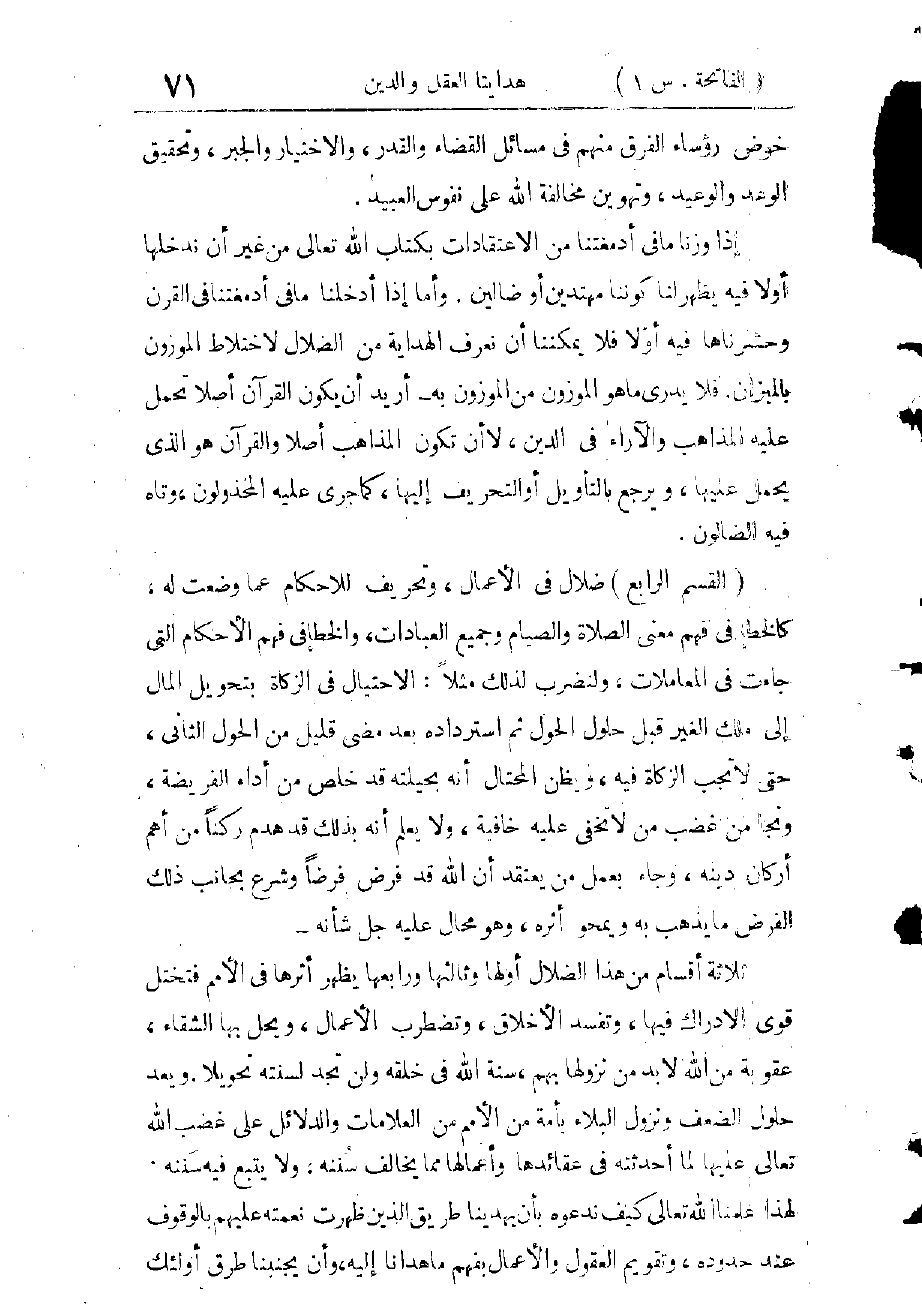 الْبَسْمَلَةِ فِي أَوَّلِ الْفَاتِحَةِ فِي جَمِيعِ الْمَصَاحِفِ الْمَجْمَعِ عَلَيْهَا الْمُتَوَاتِرَةِ حُجَّةً قَطْعِيَّةً لَا تُعَارُضَ بِأَحَادِيثِ الْآحَادِ وَإِنْ صَحَّ سَنَدُهَا.