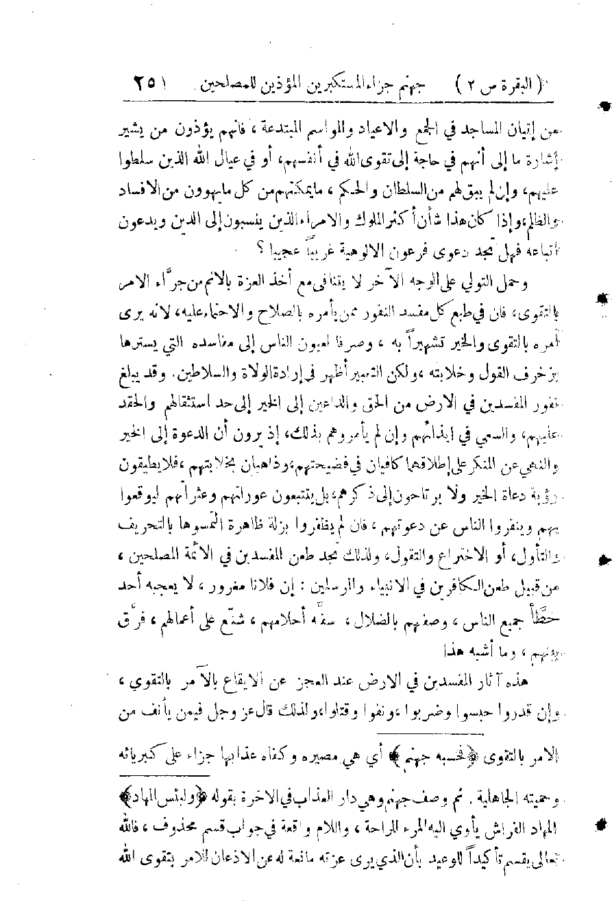 وَهَذَا الْقَوْلُ غَيْرُ ظَاهِرٍ؛ فَإِنَّ دَلَالَةَ الْآيَةِ عَلَى الْمَنْعِ الْمُطْلَقِ لَا يَتَوَقَّفُ عَلَى كَوْنِ لَفْظِ الْقِتَالِ فِيهَا عَامًّا، وَرُبَّمَا كَانَتْ دَلَالَةُ النَّكِرَةِ فِيهَا أَدَلَّ عَلَى إِطْلَاقِ الْحُكْمِ فِي كُلِّ قِتَالٍ فِي جِنْسِ الشَّهْرِ الْحَرَامِ كَمَا بَيَّنَّاهُ فِي مَعْنَى تَنْكِيرِهَا وَكَوْنِهِ لِلتَّنْوِيعِ، وَلَهُمْ فِي الْآيَةِ كَلَامٌ كَثِيرٌ، وَالظَّاهِرُ الْمُتَبَادَرُ أَنَّ إِثْبَاتَ كَوْنِ الْقِتَالِ فِي الشَّهْرِ الْحَرَامِ كَبِيرًا تَمْهِيدٌ لِلْحُجَّةِ عَلَى أَنَّ مَا فَعَلَهُ عَبْدُ اللهِ بْنُ جَحْشٍ وَمَا عَسَاهُ يَفْعَلُهُ الْمُسْلِمُونَ مِنَ الْقِتَالِ فِيهِ مَبْنِيٌّ عَلَى قَاعِدَةٍ لَا يُنْكِرُهَا عَقْلٌ، وَهِيَ وُجُوبُ ارْتِكَابِ أَخَفِّ الضَّرَرَيْنِ إِذَا لَمْ يَكُنْ بُدٌّ مِنْ أَحَدِهِمَا، وَلَا شَكَّ أَنَّ الْقِتَالَ فِي نَفْسِهِ أَمْرٌ كَبِيرٌ وَجُرْمٌ عَظِيمٌ، وَإِنَّمَا يُرْتَكَبُ لِإِزَالَةِ مَا هُوَ أَعْظَمُ مِنْهُ وَذَلِكَ قَوْلُهُ تَعَالَى: (وَصَدٌّ عَلَى سَبِيلِ اللهِ) أَيْ: وَصَدُّ النَّاسِ وَمَنْعُهُمْ عَنِ الطَّرِيقِ الْمُوَصِّلِ إِلَيْهِ تَعَالَى وَهُوَ الْإِسْلَامُ، وَهُوَ الَّذِي يَفْعَلُهُ الْمُشْرِكُونَ مِنِ اضْطِهَادِ الْمُسْلِمِينَ وَفِتْنَتِهِمْ عَنْ دِينِهِمْ; إِذْ يَقْتُلُونَ مَنْ يُسْلِمُ أَوْ يُؤْذُونَهُ فِي نَفْسِهِ وَأَهْلِهِ وَمَالِهِ، وَيَمْنَعُونَهُ مِنَ الْهِجْرَةِ إِلَى النَّبِيِّ - عَلَيْهِ الصَّلَاةُ وَالسَّلَامُ - (وَكُفْرٌ بِهِ) أَيْ: بِاللهِ تَعَالَى (وَالْمَسْجِدِ الْحَرَامِ) أَيْ: وَصَدٌّ عَنِ الْمَسْجِدِ الْحَرَامِ; وَهُوَ مَنْعُ الْمُؤْمِنِينَ مِنَ الْحَجِّ وَالِاعْتِمَارِ (وَإِخْرَاجُ أَهْلِهِ مِنْهُ) وَهُمُ النَّبِيُّ - صَلَّى اللَّهُ عَلَيْهِ وَسَلَّمَ - وَالْمُهَاجِرُونَ، وَذَلِكَ كَقَوْلِهِ فِي آيَاتِ الْإِذْنِ بِالْقِتَالِ فِي سُورَةِ الْحَجِّ: (الَّذِينَ أُخْرِجُوا مِنْ دِيَارِهِمْ بِغَيْرِ حَقٍّ إِلَّا أَنْ يَقُولُوا رَبُّنَا اللهُ) (22: 40) كُلُّ وَاحِدَةٍ مِنْ هَذِهِ الْجَرَائِمِ الَّتِي عَلَيْهَا الْمُشْرِكُونَ (أَكْبَرُ عِنْدَ اللهِ) مِنَ الْقِتَالِ فِي الشَّهْرِ الْحَرَامِ فَكَيْفَ بِهَا وَقَدِ اجْتَمَعَتْ! ! !