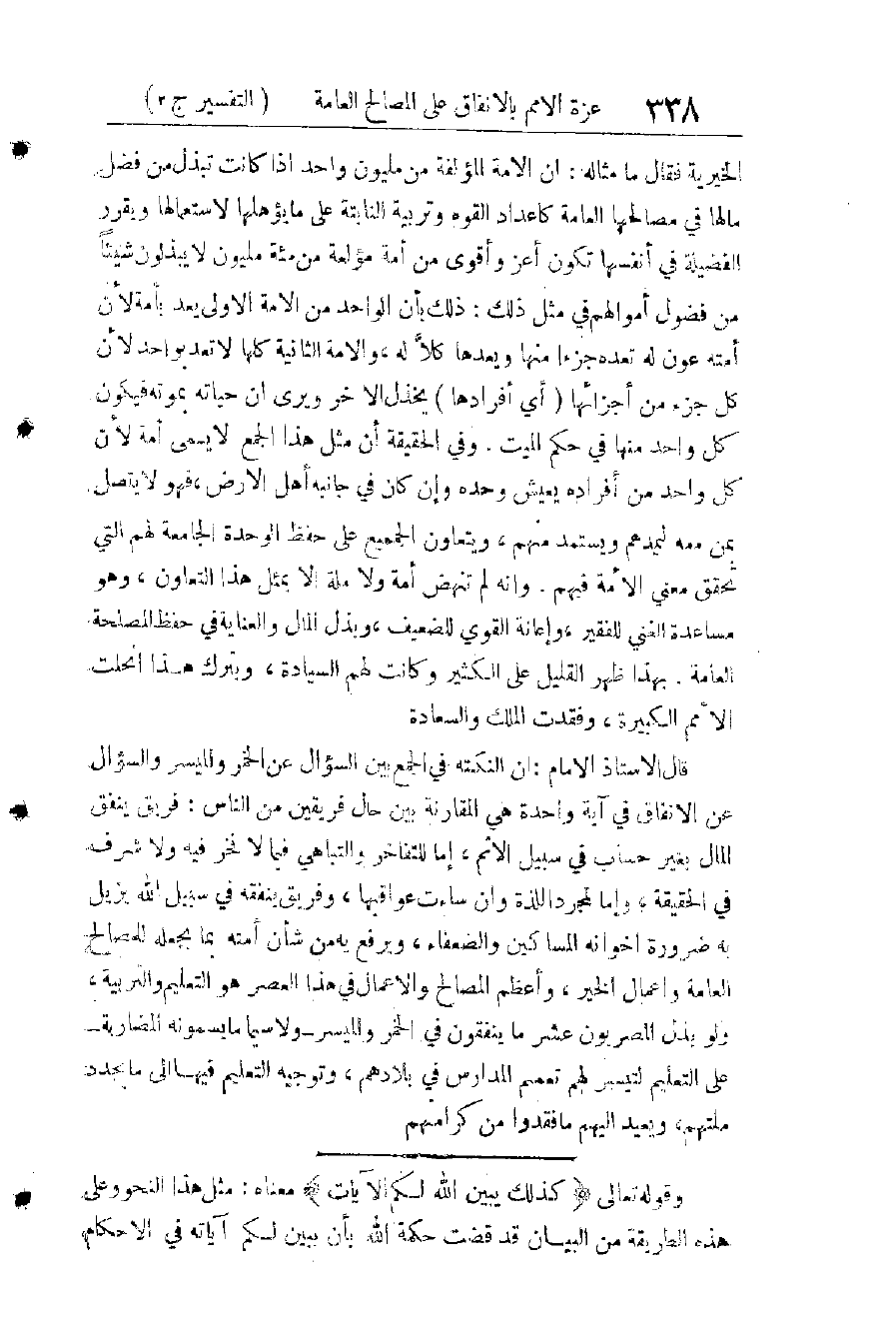 يُعَرِّضَ الرَّجُلُ لِلْمَرْأَةِ فِي الْعِدَّةِ بِأَمْرِ الزَّوَاجِ تَعْرِيضًا، وَقَرَنَ ذَلِكَ بِمَا يَكُونُ مِنَ النِّيَّةِ فِي الْقَلْبِ وَالْعَزْمِ الْمَسْتَكِنِّ فِي الضَّمِيرِ، كَأَنَّهُ مِثْلُهُ فِي تَعَذُّرِ الِاحْتِرَازِ مِنْهُ أَوْ تَعَسُّرِهِ، وَلَمْ يُحَرِّمْ عَلَيْهِمْ أَنْ يَقْطَعُوا فِي هَذَا الْأَمْرِ بِأَنْفُسِهِمْ لِأَنَّ الْأَمْرَ أَمْرٌ دِينِيٌّ، بَلْ رَاعَى فِيمَا شَرَعَهُ لَهُمْ مَا فَطَرَهُمْ عَلَيْهِ، وَلِذَلِكَ ذَكَرَ وَجْهَ الرُّخْصَةِ فَقَالَ: (عَلِمَ اللهُ أَنَّكُمْ سَتَذْكُرُونَهُنَّ) فِي أَنْفُسِكُمْ، وَخَطِرَاتُ قُلُوبِكُمْ لَيْسَتْ فِي أَيْدِيكُمْ، وَيَشُقُّ عَلَيْكُمْ أَنْ تَكْتُمُوا رَغْبَتَكُمْ وَتَصْبِرُوا عَنِ النُّطْقِ لَهُنَّ بِمَا فِي أَنْفُسِكُمْ، فَرَخَّصَ لَكُمْ فِي التَّعْرِيضِ دُونَ التَّصْرِيحِ، فَقِفُوا عِنْدَ حَدِّ الرُّخْصَةِ (وَلَكِنْ لَا تُوَاعِدُوهُنَّ سِرًّا) أَيْ فِي السِّرِّ; فَإِنَّ الْمُوَاعَدَةَ السِّرِّيَّةَ مَدْرَجَةُ الْفِتْنَةِ وَمَظِنَّةُ الظِّنَّةِ. وَالتَّعْرِيضُ يَكُونُ فِي الْمَلَأِ لَا عَارَ فِيهِ وَلَا قُبْحَ، وَلَا تَوَسُّلَ إِلَى مَا لَا يُحْمَدُ، وَذَهَبَ جُمْهُورُ الْعُلَمَاءِ إِلَى أَنَّ السِّرَّ هُنَا كِنَايَةٌ عَنِ النِّكَاحِ; أَيْ: لَا تَعْقِدُوا مَعَهُنَّ وَعْدًا صَرِيحًا عَلَى التَّزَوُّجِ بِهِنَّ، قَالَ الْأُسْتَاذُ الْإِمَامُ: عَبَّرَ عَنِ النِّكَاحِ بِالسِّرِّ; لِأَنَّهُ يَكُونُ سِرًّا فِي الْغَالِبِ، وَرُوِيَ عَنِ ابْنِ عَبَّاسٍ أَنَّهُ قَالَ: الْمُوَاعَدَةُ سِرًّا أَنْ يَقُولَ لَهَا: إِنِّي عَاشِقٌ وَعَاهِدِينِي أَلَّا تَتَزَوَّجِي غَيْرِي وَنَحْوَ هَذَا، وَقِيلَ: هِيَ الْمُوَاعَدَةُ عَلَى الْفَاحِشَةِ، وَالدَّلِيلُ عَلَى أَنَّ النَّهْيَ عَامٌّ يُرَادُ بِهِ تَحْرِيمُ الْكَلَامِ الصَّرِيحِ