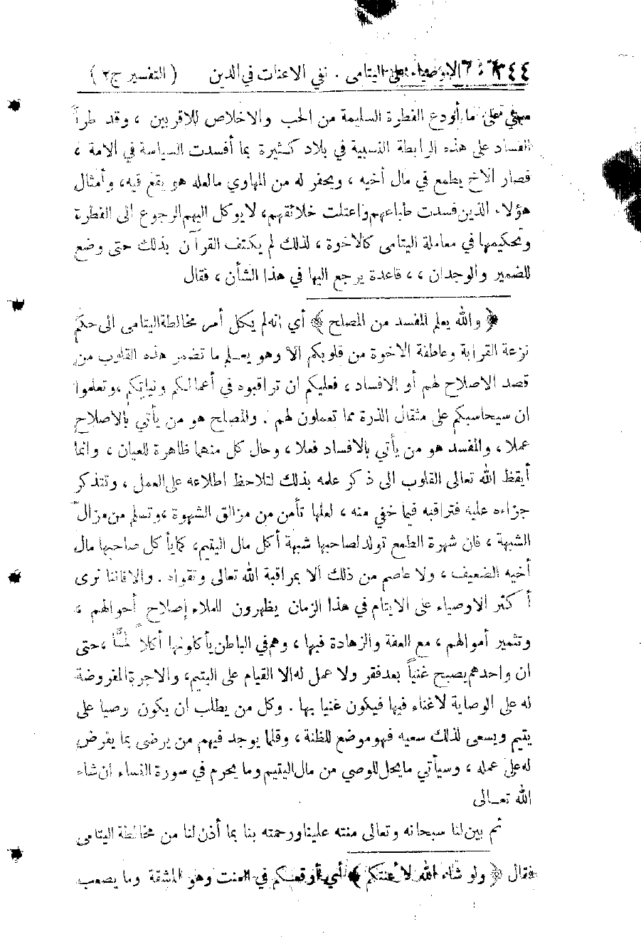 الصِّلَةِ مِنْ رَوَابِطِ الْأَزْوَاجِ. وَسَرَدَ فِي الدَّرْسِ وَقَائِعَ تُؤَيِّدُ مَا ذَكَرَهُ (مِنْهَا) أَنَّ رَجُلًا هَجَرَ زَوْجَتَهُ - وَهِيَ ابْنَةُ عَمِّهِ وَلَهُ مِنْهَا بِنْتٌ - بِغَيْرِ ذَنْبٍ غَيْرِ الطَّمَعِ فِي الْمَالِ، فَكَانَ كُلَّمَا كَلَّمُوهُ فِي شَأْنِهَا قَالَ: لِتَشْتَرِ عِصْمَتَهَا مِنِّي. (وَمِنْهَا) مَا هُوَ أَدْهَى مِنْ ذَلِكَ وَأَمَرُّ كَالَّذِينِ يَتْرُكُونَ نِسَاءَهُمْ بِغَيْرِ نَفَقَاتٍ حَتَّى قَدْ يَضْطَرُّوهُنَّ إِلَى بَيْعِ أَعْرَاضِهِنَّ، وَكَالْمُطَلَّقَاتِ الْمُعْتَدَّاتِ بِالْقُرُوءِ يَزْعُمْنَ أَنَّ حَيْضَهُنَّ حَبْسٌ، فَتَمُرُّ السُّنُونَ وَلَا تَنْقَضِي عِدَّتُهُنَّ بِزَعْمِهِنَّ، وَمَا الْغَرَضُ إِلَّا إِلْزَامُ الْمُطَلِّقِ النَّفَقَةَ طُولَ هَذِهِ الْمُدَّةِ انْتِقَامًا مِنْهُ، وَكَالَّذِينِ يَذَرُونَ أَزْوَاجَهُمْ كَالْمُعَلَّقَاتِ لَا يُمْسِكُونَهُنَّ بِمَعْرُوفٍ وَلَا يُسَرِّحُونَهُنَّ بِإِحْسَانٍ، أَوْ يَفْتَدِينَ مِنْهُمْ بِالْمَالِ، فَأَيْنَ اللهُ وَأَيْنَ كِتَابُ اللهِ وَشَرْعُهُ مِنْ هَؤُلَاءِ وَأَيْنَ هُمْ مِنْهُ؟ إِنَّهُمْ لَيْسُوا مِنْ كِتَابِ اللهِ فِي شَيْءٍ، وَلَكِنَّ الْمُسْرِفِينَ أَهْوَاءَهُمْ يَتَّبِعُونَ.