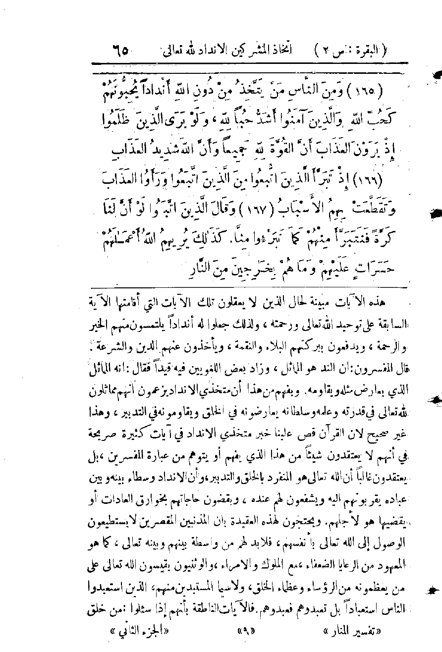 وَأَمَّا مَنْ يُبْدِي فِي الدِّينِ فَهْمًا، وَيُقَرِّرُ بِحَسَبِ مَا ظَهَرَ لَهُ مِنَ الدَّلِيلِ حُكْمًا، يُرِيدُ أَنْ يَفْتَحَ بِهِ لِلنَّاسِ أَبْوَابَ الْفِقْهِ، وَيُسَهِّلَ لَهُمْ طَرِيقَ الْعِلْمِ، ثُمَّ هُوَ يَأْمُرُ النَّاسَ بِأَنْ يَعْرِضُوا قَوْلَهُ عَلَى كِتَابِ اللهِ وَسُنَّةِ رَسُولِهِ، وَيَنْهَاهُمْ أَنْ يَأْخُذُوا بِهِ إِلَّا أَنْ يَقْتَنِعُوا بِدَلِيلِهِ ; فَهُوَ مِنْ أَئِمَّةِ الْهُدَى، أَعْلَامِ التُّقَى، وَلَيْسَ يَضُرُّهُ أَنْ يُقَلِّدَ فِيهِ بِغَيْرِ عِلْمِهِ، وَيَجْعَلَ نِدًّا لِلَّهِ مِنْ بَعْدِ مَوْتِهِ، فَإِنَّهُ إِذَا كَانَ مُخْطِئًا وَجَاءَ ذَلِكَ الْمُقَلِّدُ لَهُ عَلَى غَيْرِ بَصِيرَةٍ يَوْمَ الْقِيَامَةِ يَنْسِبُ ضَلَالَهُ إِلَيْهِ، فَإِنَّهُ يَتَبَرَّأُ مِنْهُ بِحَقٍّ وَيَقُولُ: مَا أَمَرْتُكَ أَنْ تَأْخُذَ بِقَوْلِي عَلَى عِلَّاتِهِ وَلَا أَعْرِفُكَ، فَالَّذِينَ يُتَّخَذُونَ أَنْدَادًا يَتَبَرَّءُونَ كُلُّهُمْ يَوْمَ الْقِيَامَةِ مِمَّنِ اتَّخَذُوهُمْ، وَلَكِنَّهُمْ يَكُونُونَ عَلَى قِسْمَيْنِ: قِسْمٌ عَبَدَهُمُ النَّاسُ كَالْمَسِيحِ وَبَعْضِ أُولِي الْعِلْمِ وَالتَّقْوَى مِنْ هَذِهِ الْأُمَّةِ وَمِنَ الْأُمَمِ قَبْلَهَا، أَوْ قَلَّدُوهُمْ وَأَخَذُوا بِأَقْوَالِهِمْ فِي الدِّينِ مِنْ غَيْرِ دَلِيلٍ شَرْعِيٍّ كَبَعْضِ الْأَئِمَّةِ الْمُهْتَدِينَ مِنْ غَيْرِ أَنْ يَأْمُرَهُمْ هَؤُلَاءِ بِعِبَادَتِهِمْ أَوْ تَقْلِيدِهِمْ، بَلْ مَعَ نَهْيِهِمْ إِيَّاهُمْ عَنْ عِبَادَةِ غَيْرِ اللهِ تَعَالَى وَعَنِ الِاعْتِمَادِ عَلَى غَيْرِ وَحْيِهِ فِي الدِّينِ، فَهَذَا الْقِسْمُ غَيْرُ مُرَادٍ هُنَا ; لِأَنَّ الَّذِينَ عَبَدُوا أُولَئِكَ الْأَخْيَارَ أَوْ قَلَّدُوهُمْ فِي دِينِهِمْ لَمْ يَتَّبِعُوهُمْ فِي الْحَقِيقَةِ ; إِذِ اتِّبَاعُهُمْ هُوَ اتِّبَاعُ طَرِيقَتِهِمْ فِي الدِّينِ، وَمَا كَانُوا يُشْرِكُونَ بِاللهِ أَحَدًا وَلَا شَيْئًا، وَلَا يُقَلِّدُونَ فِي دِينِهِ أَحَدًا وَإِنَّمَا كَانُوا يَأْخُذُونَ دِينَهُ عَنْ وَحْيِهِ فَقَطْ. وَقِسْمٌ أَضَلُّوا النَّاسَ بِأَحْوَالِهِمْ وَأَقْوَالِهِمْ فَاتَّبَعُوهُمْ عَلَى غَيْرِ بَصِيرَةٍ وَلَا هُدًى، فَهَؤُلَاءِ هُمُ الَّذِينَ يَتَبَرَّأُ بَعْضُهُمْ مِنْ بَعْضٍ، وَيَلْعَنُ بَعْضُهُمْ بَعْضًا، إِذْ تَتَقَطَّعُ بِهِمْ أَسْبَابُ الْأَهْوَاءِ وَالْمَنَافِعِ الدُّنْيَوِيَّةِ الَّتِي تَرْبِطُ - هُنَا - بَعْضَهُمْ بِبَعْضٍ.