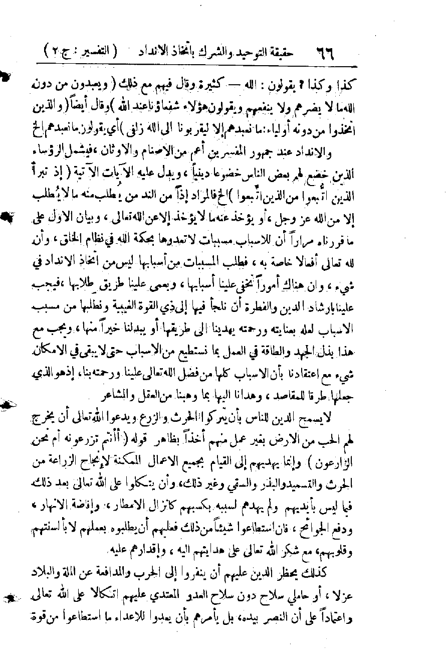 الْمُسْلِمِينَ وَالْقُرْآنِ إِذْ يَصْرِفُونَ كُلَّ وَعِيدٍ فِيهِ إِلَى الْمُشْرِكِينَ وَالْيَهُودِ وَالنَّصَارَى فَيَنْصَرِفُونَ عَنِ الِاعْتِبَارِ الْمَقْصُودِ ; لِهَذَا تَرَى الْمُسْلِمِينَ لَا يَتَّعِظُونَ بِالْقُرْآنِ، وَيَحْسَبُونَ أَنَّ كَلِمَةَ ((لَا إِلَهَ إِلَّا اللهُ)) يَتَحَرَّكُ بِهَا اللِّسَانُ مِنْ غَيْرِ قِيَامٍ بِحُقُوقِهَا كَافِيَةٌ لِلنَّجَاةِ فِي الْآخِرَةِ، عَلَى أَنَّ كَثِيرًا مِنَ الْكَافِرِينَ يَقُولُهَا، وَمِنْهُمْ مَنْ يَهُزُّ جَسَدَهُ عِنْدَ ذِكْرِ اللهِ كَمَا يَهُزُّهُ جَمَاهِيرُهُمْ، فَهَلْ هَذَا كُلُّ مَا أَرَادَهُ اللهُ مِنْ إِنْزَالِ الْقُرْآنِ وَبِعْثَةِ مُحَمَّدٍ - عَلَيْهِ الصَّلَاةُ وَالسَّلَامُ -؟