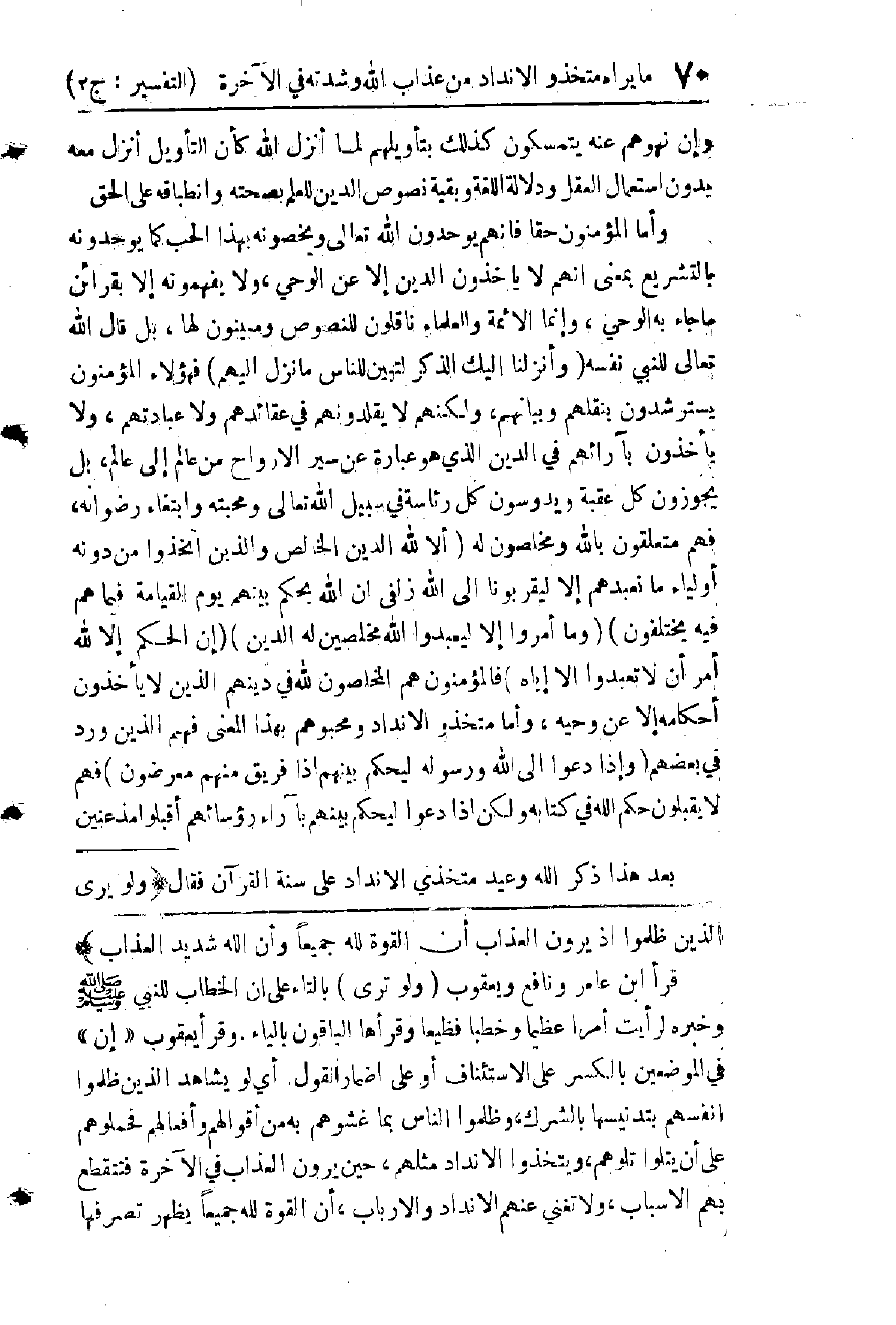 وَهَلْ هُوَ فِيهِ عَلَى هُدًى مِنْ رَبِّهِ أَمْ لَا، وَقِسْمٌ يُعْتَمَدُ عَلَيْهِ وَيُدْعَى فِي دَفْعِ الْمَضَارِّ وَجَلْبِ الْمَنَافِعِ مِنْ طَرِيقِ السُّلْطَةِ الْغَيْبِيَّةِ لَا مِنْ طَرِيقِ الْأَسْبَابِ، حَتَّى إِنَّهُمْ لَيَعْتَمِدُونَ عَلَى إِغَاثَةِ هَؤُلَاءِ الْأَنْدَادِ لِلنَّاسِ بَعْدَ مَوْتِهِمْ وَخُرُوجِهِمْ مِنْ عَالَمِ الْأَسْبَابِ، ثُمَّ بَيَّنَتْ أَنَّ النَّاسَ يَتَّبِعُ بَعْضُهُمْ بَعْضًا فِي ذَلِكَ، وَأَنْ سَيَتَبَرَّأَ الَّذِينَ اتُّبِعُوا مِنَ الَّذِينَ اتَّبَعُوا عِنْدَ رُؤْيَةِ الْعَذَابِ وَتَقَطُّعِ الْأَسْبَابِ بَيْنَهُمْ، وَقُلْنَا فِي تَفْسِيرِهَا: إِنَّ الْأَسْبَابَ هِيَ الْمَنَافِعُ الَّتِي يَجْنِيهَا الرُّؤَسَاءُ مِنَ الْمَرْءُوسِينَ وَالْمَصَالِحُ الدُّنْيَوِيَّةُ الَّتِي تَصِلُ بَعْضَهُمْ بِبَعْضٍ. وَفِي هَذِهِ الْآيَاتِ يُبَيِّنُ تَعَالَى أَنَّ تِلْكَ الْأَسْبَابَ مُحَرَّمَةٌ ; لِأَنَّهَا تَرْجِعُ إِلَى أَكْلِ الْخَبَائِثِ وَاتِّبَاعِ خُطُوَاتِ الشَّيْطَانِ وَنَهَى