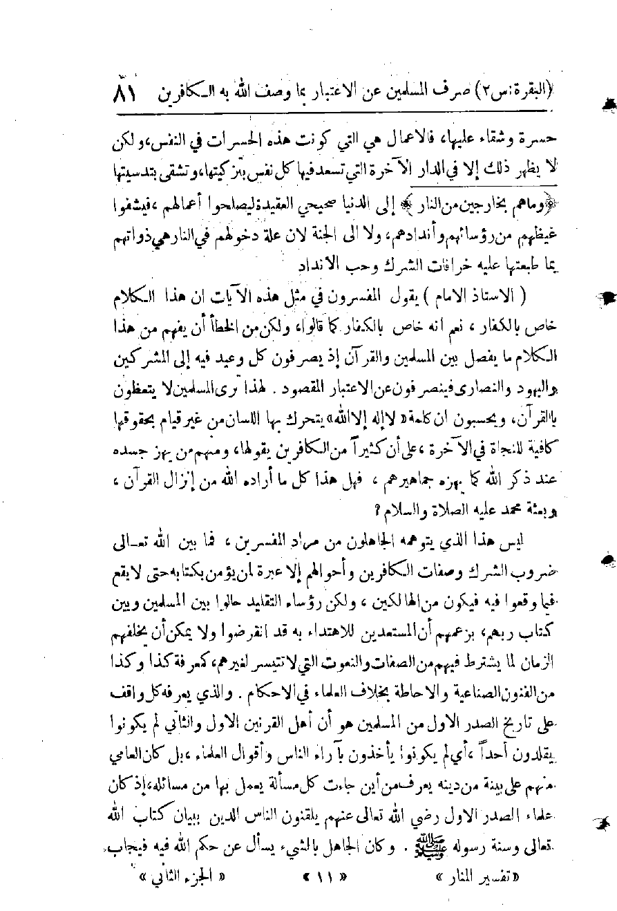 هَذَا مُلَخَّصُ مَا قَالَهُ الْأُسْتَاذُ الْإِمَامُ فِي الدَّرْسِ، وَاقْتَصَرْتُ عَلَيْهِ فِي الطَّبْعَةِ الْأُولَى وَقَرَأَهُ هُوَ فِيهَا، وَأَقُولُ الْآنَ: إِنَّهُ رَحِمَهُ اللهُ كَانَتْ خُطَّتُهُ الْغَالِبَةُ فِيهِ تَرْكَ ذِكْرِ الْمَسَائِلِ الْخِلَافِيَّةِ الَّتِي لَا يَدُلُّ عَلَيْهَا الْقُرْآنُ، وَهَذَا غَيْرُ الْخِلَافِ فِي مَدْلُولِ عِبَارَاتِهِ كَمَا هُنَا، وَرُبَّمَا يَكُونُ ذِكْرُ الْخِلَافِ وَسِيلَةً إِلَى بَيَانِ كَوْنِهِ فَوْقَ كُلِّ خِلَافٍ.